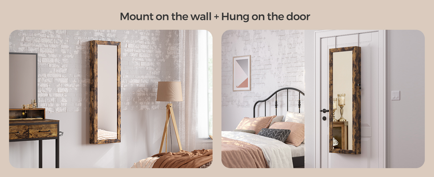 Ajtó vagy fal? Ez az Ön döntése! Ezt a függő ékszerszekrényt egyszerűen az ajtókeretre helyezheti a mellékelt tartók segítségével, vagy rögzítheti egy tömör falhoz a mellékelt csavarok segítségével; mindkét esetben helytakarékos.