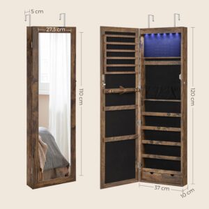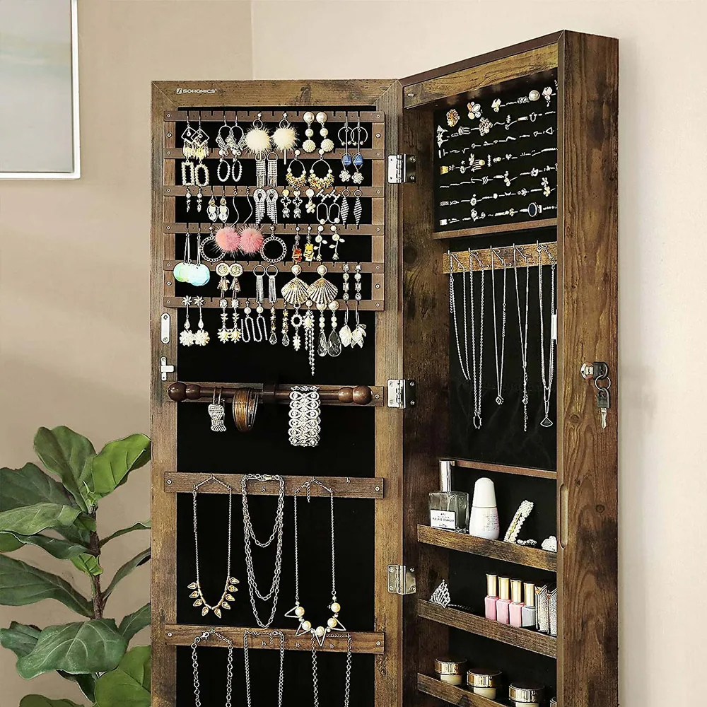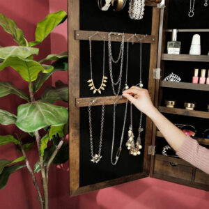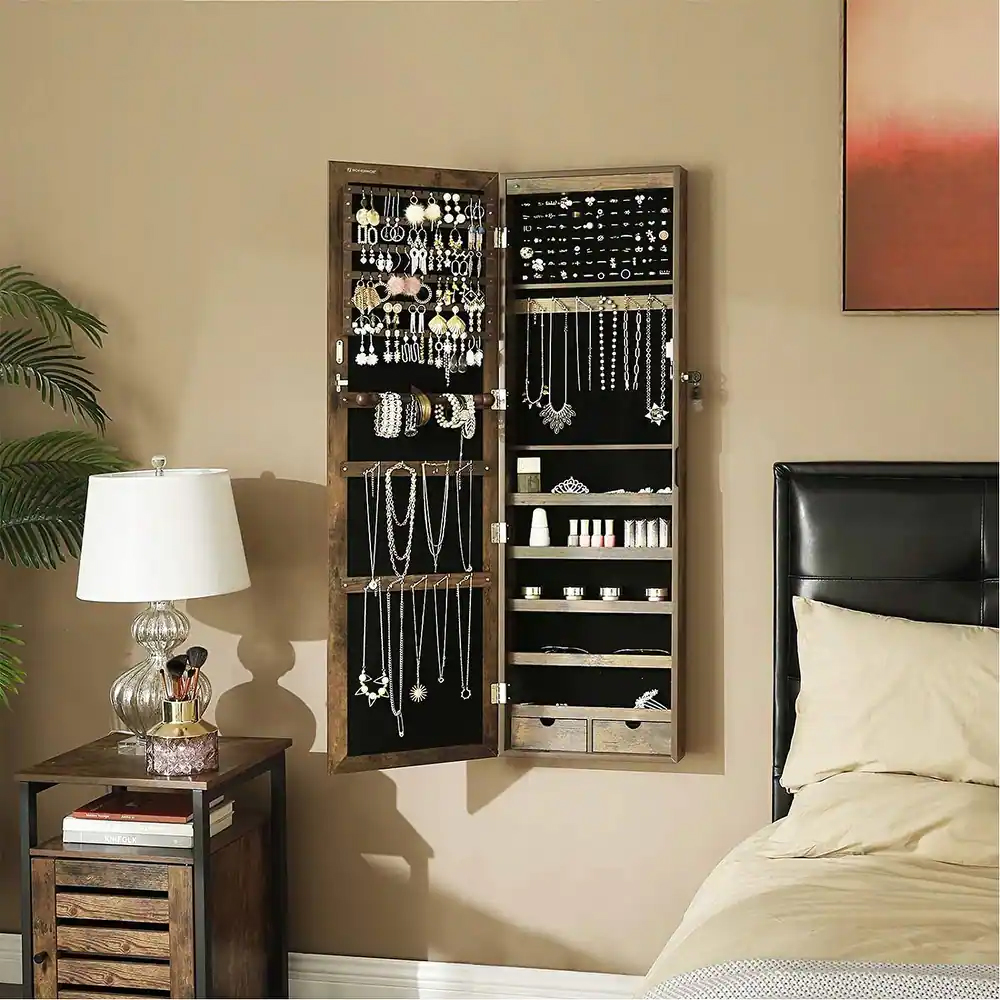 Felejtse el az elveszett és kusza ékszerekkel teli napokat, és emelje magasabb szintre napi szépségápolási rutinját ezzel az elegáns, üvegtükörrel, letisztult vonalakkal és rusztikus, barna bevonattal ellátott ékszerszekrénnyel.