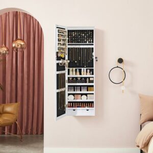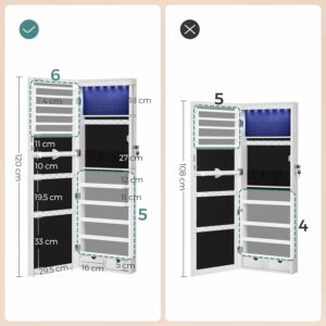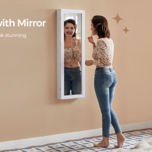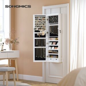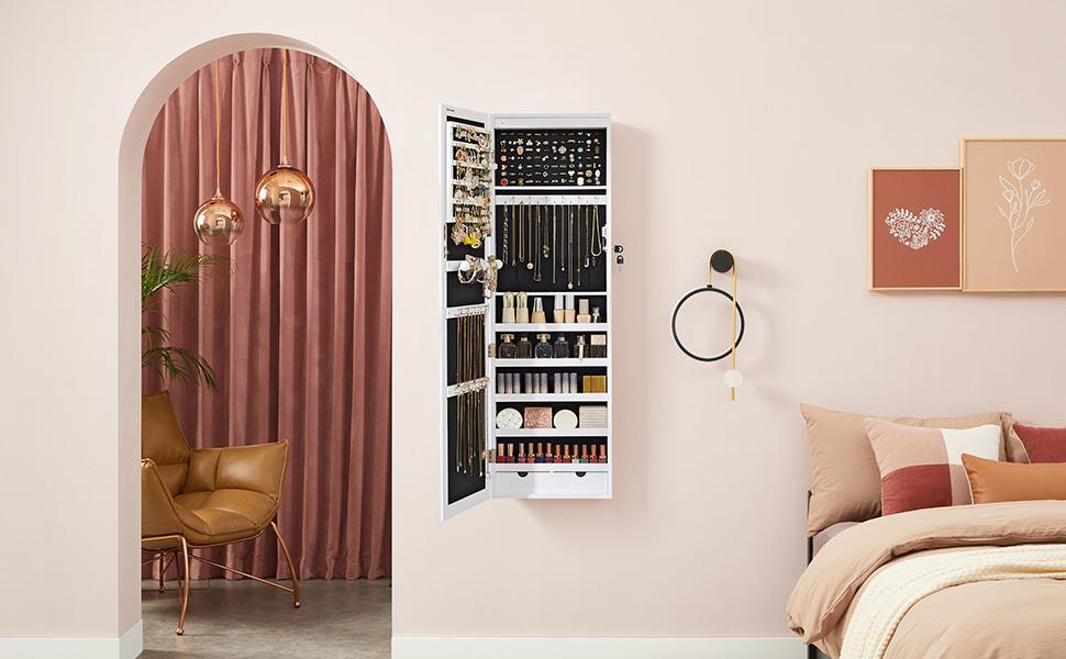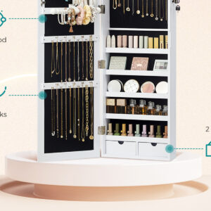 Ezt az ékszerszekrényt egyszerűen az ajtókeretre felfüggesztve helyezheti a mellékelt támasztékok segítségével, vagy egyszerűen rögzítheti egy tömör falhoz a mellékelt csavarok segítségével; mindkét esetben több helyet takarít meg.