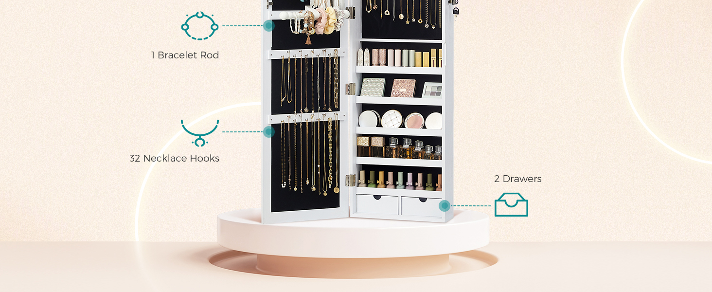 84 hely a gyűrűknek, 90 nyílás a fülbevalóknak, 48 lyuk a fülbevalóknak, 32 kampó a nyakláncoknak, 5 polc, 2 fiók és 1 rúd a karkötőknek, mindez egy helyen.