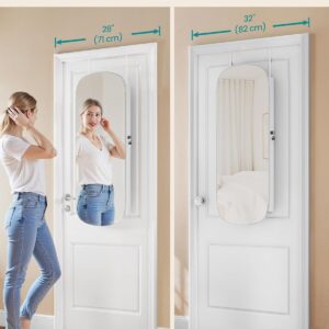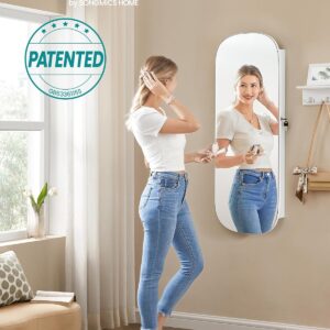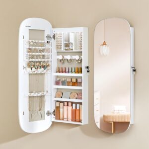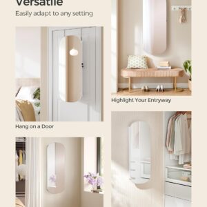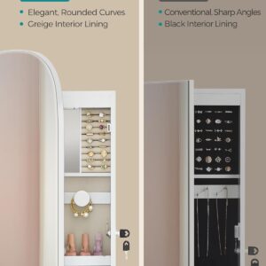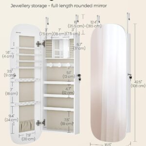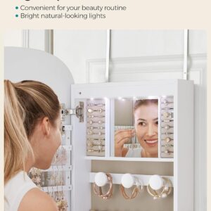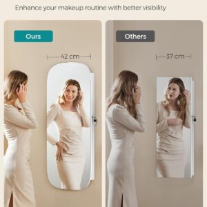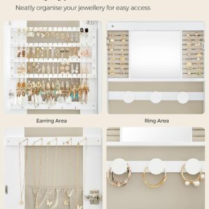 SONGMICS Ekszertarolo szekreny tukorrel es LED vilagitassal, falra vagy ajtora szerelheto, kulccsal zarhato, 42x10x108 cm, feher