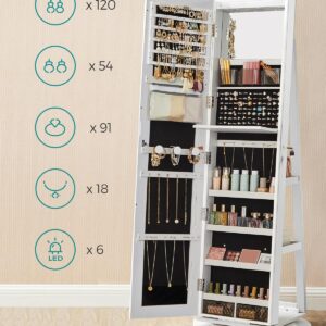 Belső tükör világítással: Ebben az ékszerszekrényben 6 db LED lámpás belső tükör található, így gyorsan kiválaszthatja a megfelelő ékszert, vagy precízen ellenőrizheti a sminkjét.
