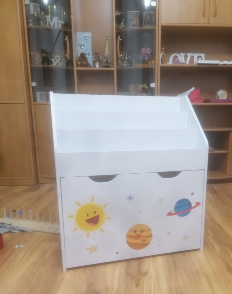 3 rafturi deschise in partea de sus il vor ajuta pe micutul dvs. sa isi alinieze cartile preferate de diferite dimensiuni, iar o cutie de jucarii cu roti ii permite sa o scoata pentru a-si gasi colectia de jucarii.