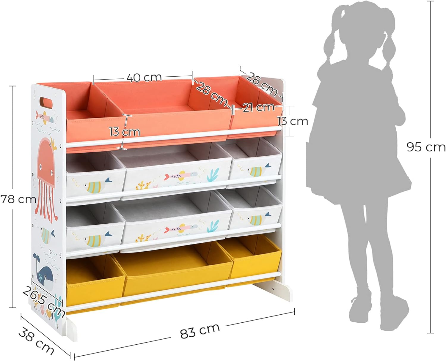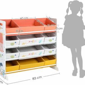 Comorile copiilor dvs. sunt ascunse in haos? Ez a polc mindennek elegendő helyet biztosít. A 12 különböző színű és méretű szövetdoboz elegendő helyet biztosít a könyvek, babák és egyéb játékok rendben tartásához.