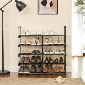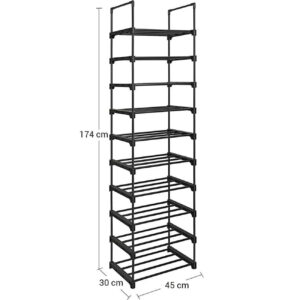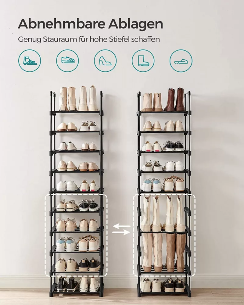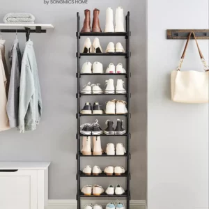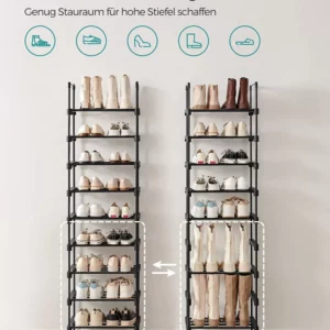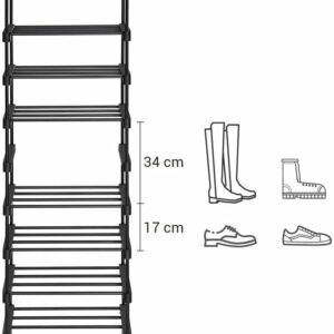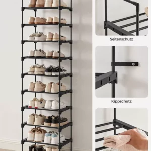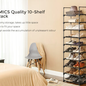 Spatios, dar care economiseste spatiu: Datorita siluetei sale subtiri, acest suport de pantofi cu 10 nivele ocupa putin spatiu pe podea, dar ofera suficient spatiu de depozitare pentru 20 de perechi de pantofi.