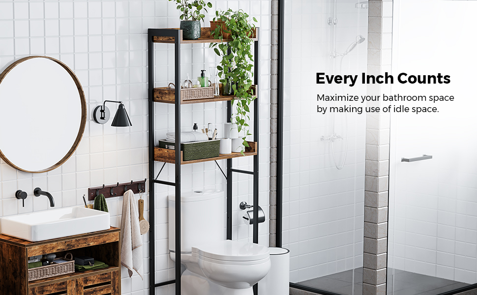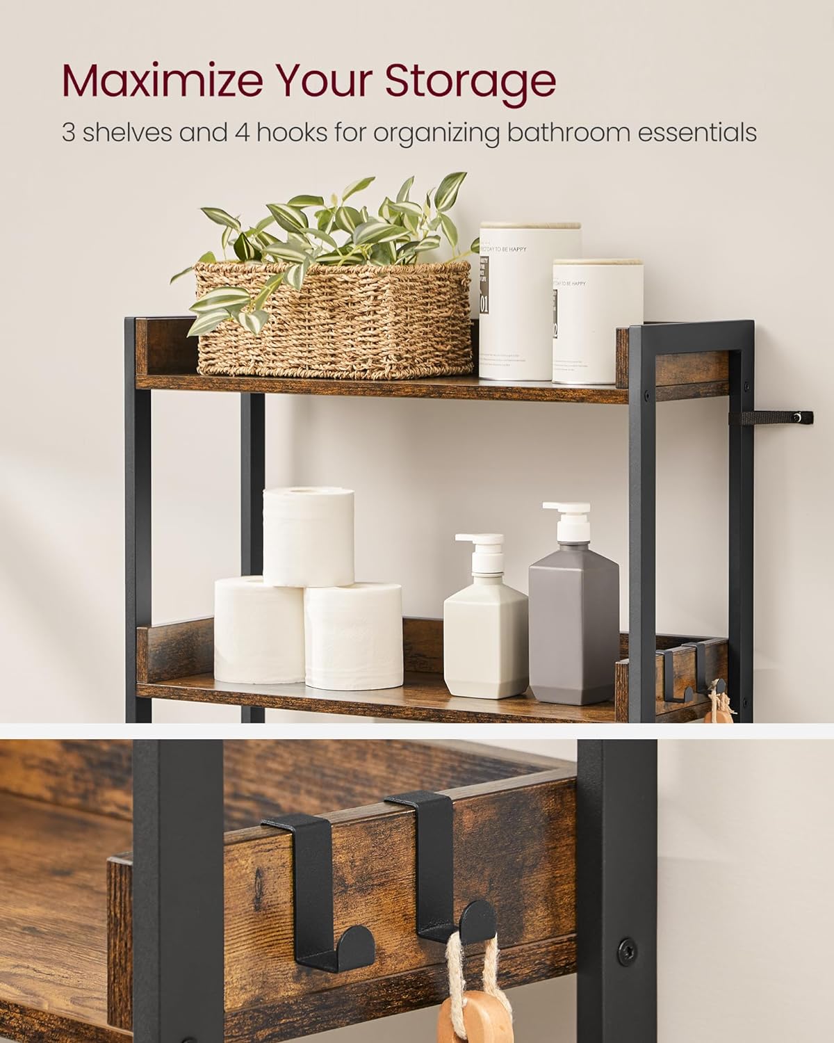 Ez a 3 polccal rendelkező fürdőszobai polc a WC felett jól kihasználja a már foglalt teret, és rengeteg extra tárolóhelyet biztosít a piperecikkek rendezéséhez vagy a dekorációk megjelenítéséhez.
