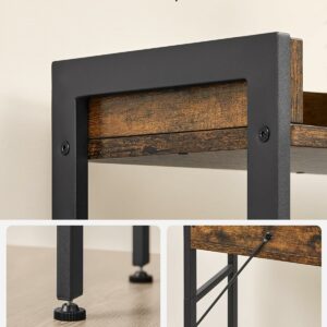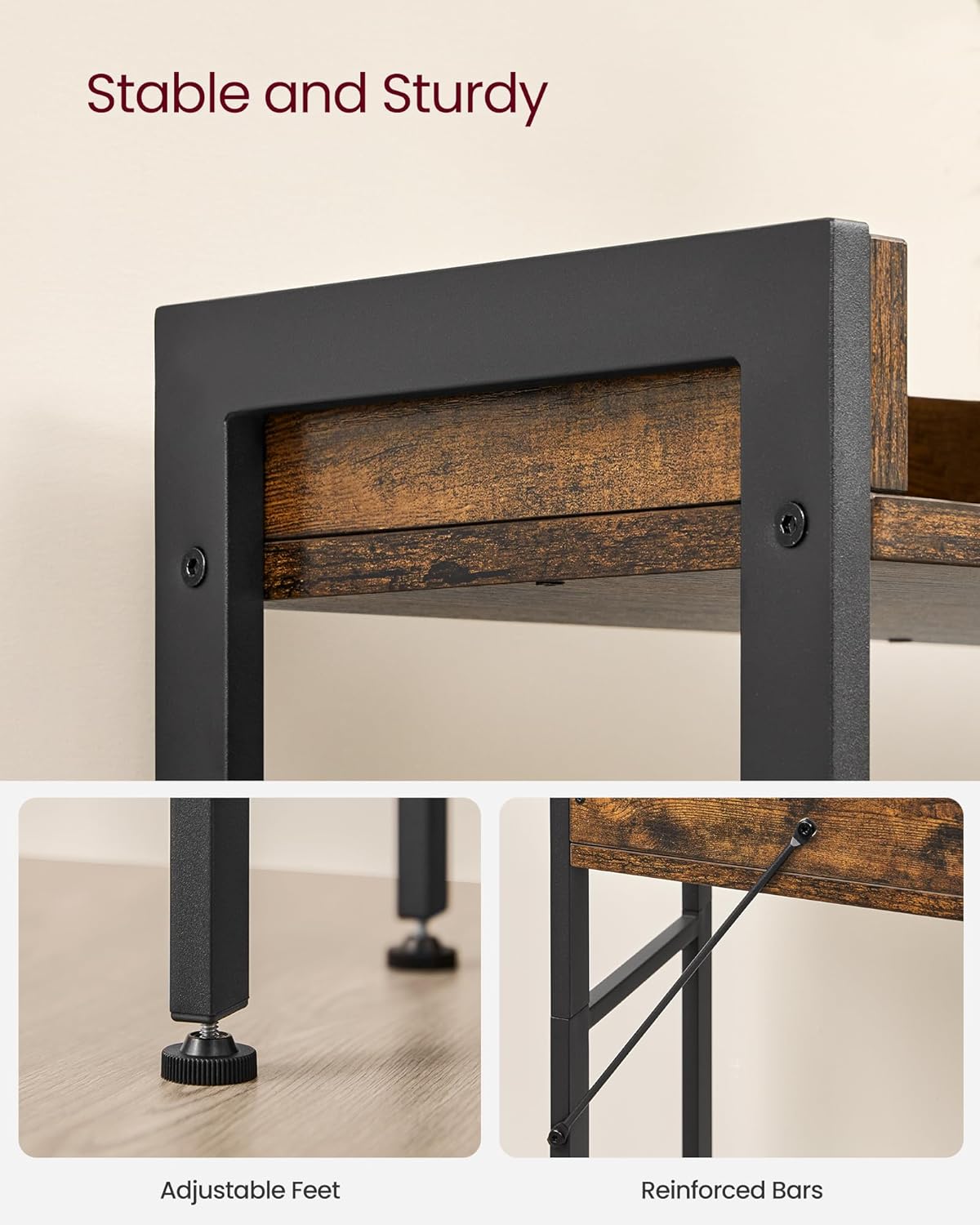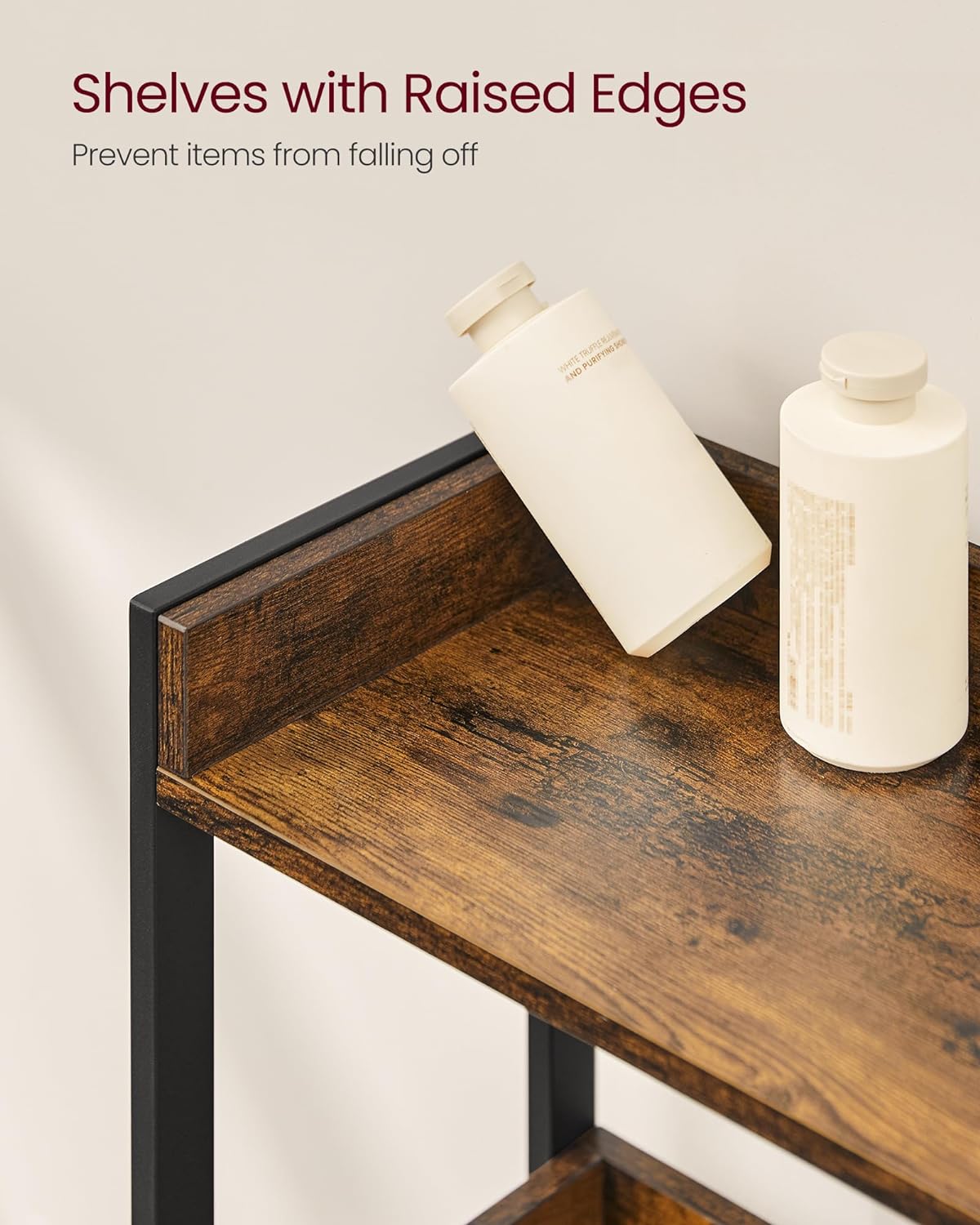 Az agglomerált deszkák és az acélkeret kombinációja robusztus szerkezetet ad ennek a fürdőszobai polcnak; a billenésgátló készlet biztosítja a stabilitást, és az egyes polcok körüli megemelt élek megakadályozzák, hogy a tárgyak leessenek róla