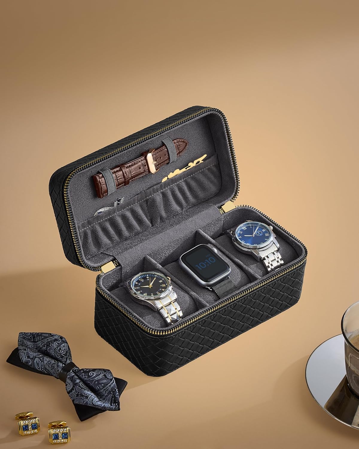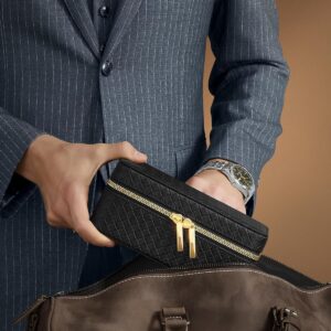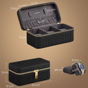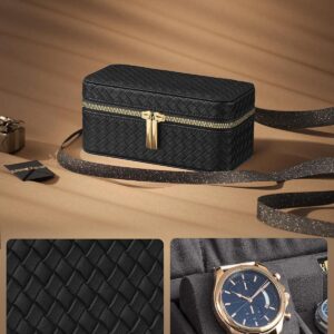 A SONGMICS Ronne Collection ora doboz a klasszikus eleganciat modern funkcionalitassal kombinalja. Fonott hatasu PU borbol es puha velur belsobol keszult, igy egyszerre nyujt vedelmet es stilust. 3 tagas rekesszel es tovabbi zsebekkel rendelkezik, idealis orak es kiegeszitok biztonsagos tarolasara, otthon vagy utazas soran.