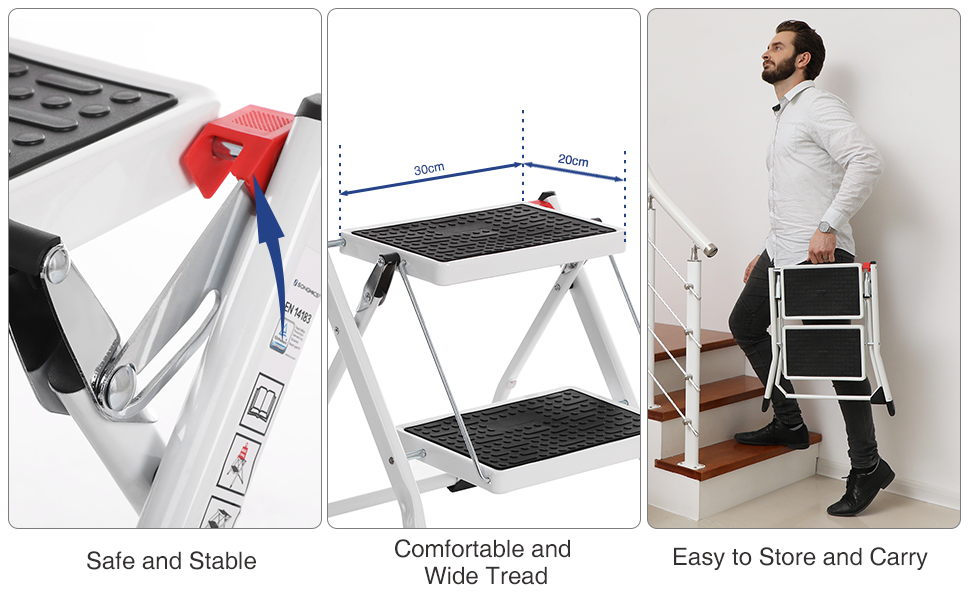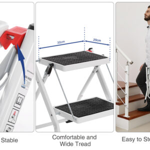 Ce primiti: O scara pliabila cu 2 trepte, usoara si compacta, cu un maner de transport pentru diferite treburi casnice.