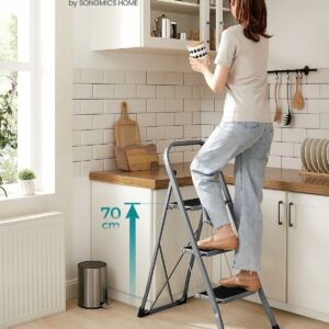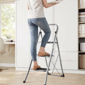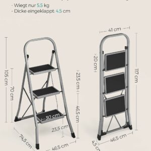 Ce primiti: O scara pliabila multifunctionala din otel cu 3 trepte si o balustrada practica.