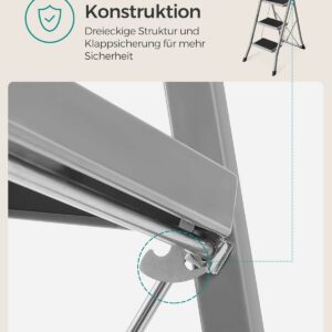 Scara fabricata din otel solid, cu incuietoare de pliere si 4 picioare orientate spre exterior asigura o stabilitate ridicata; atunci cand este complet deschisa, carligul de siguranta se blocheaza automat in pozitie si previne plierea nedorita.