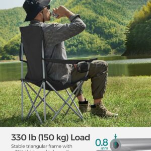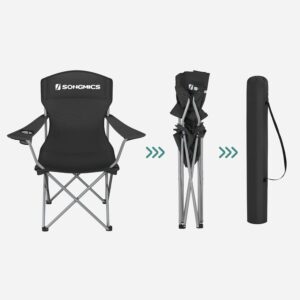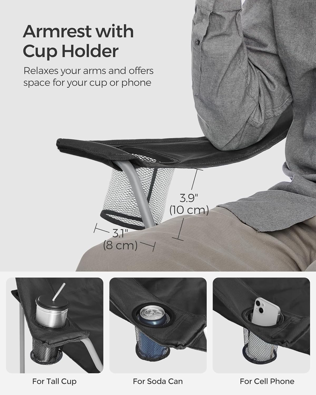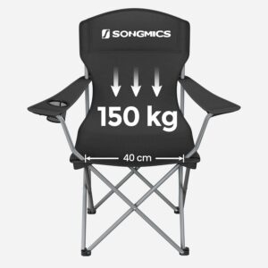 Cadru de otel, tuburi cu grosimea peretelui de 0,8 mm – foarte rezistent; Tesatura Oxford 600D cu acoperire rezistenta la apa – foarte rezistenta la uzura si durabila. Scaunul de camping suporta pana la 150 kg.