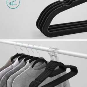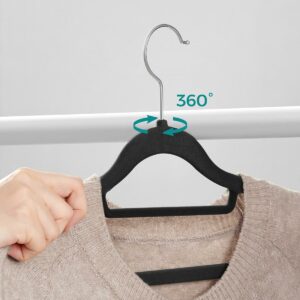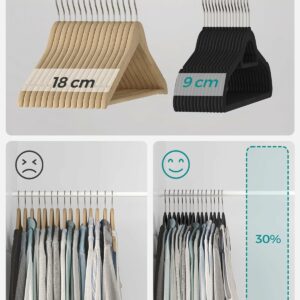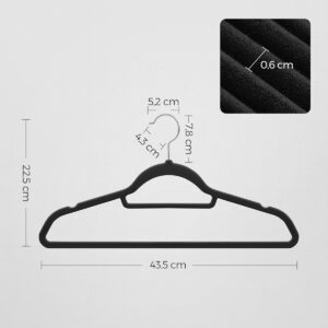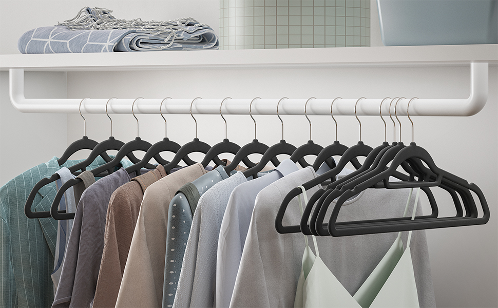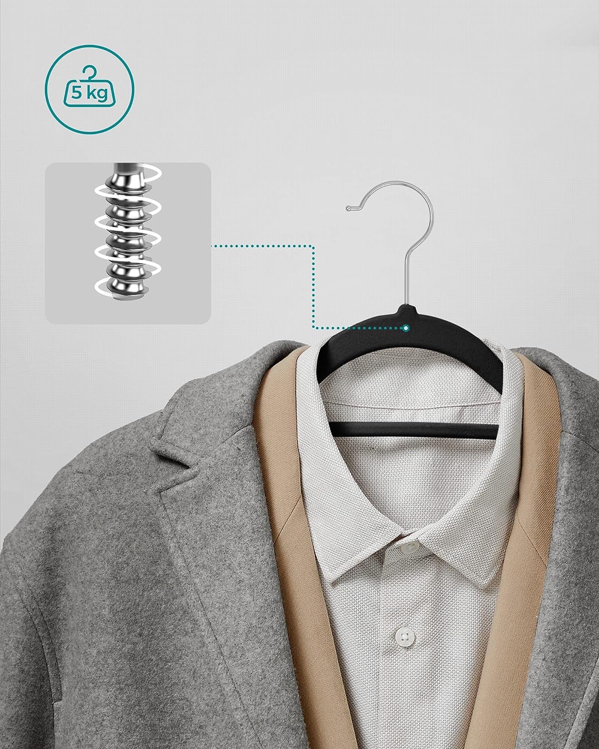 Minden bársony akasztó vékony profillal rendelkezik, így több ruha is akasztható ugyanabban a helyen; a központi rúd sálak vagy nyakkendők számára használható.