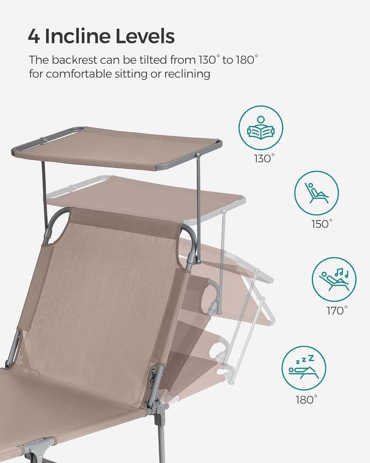 Acest sezlong are un spatar reglabil cu 4 pozitii de inclinare si o tetiera detasabila. Pur si simplu reglati-l in pozitia preferata.