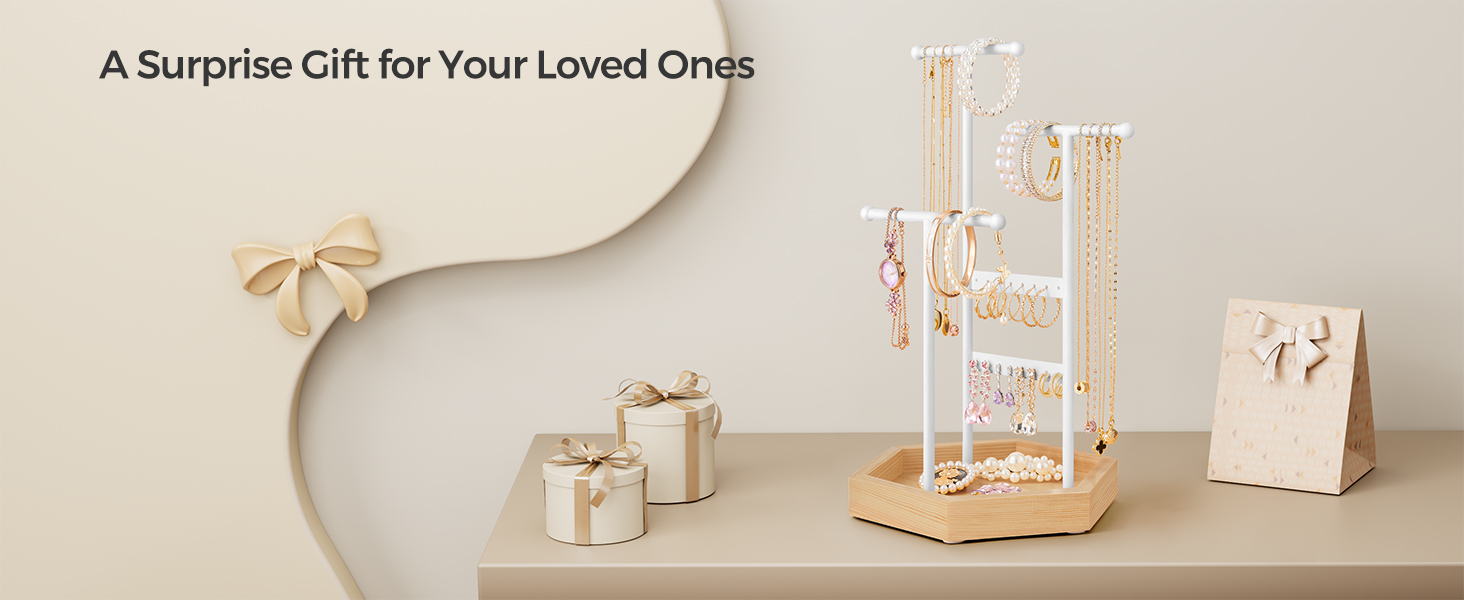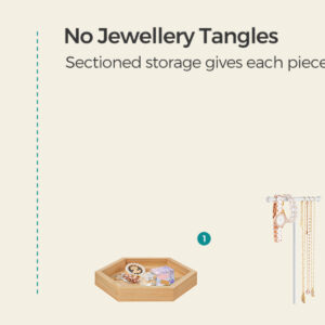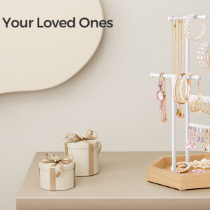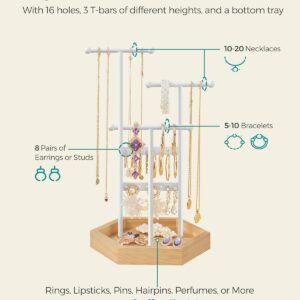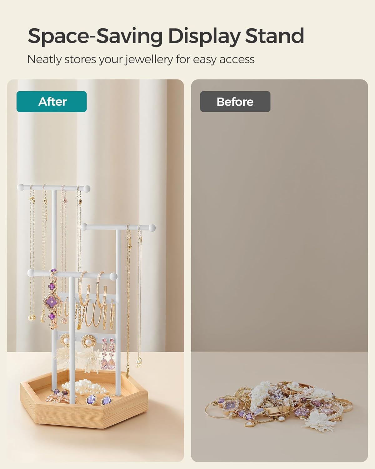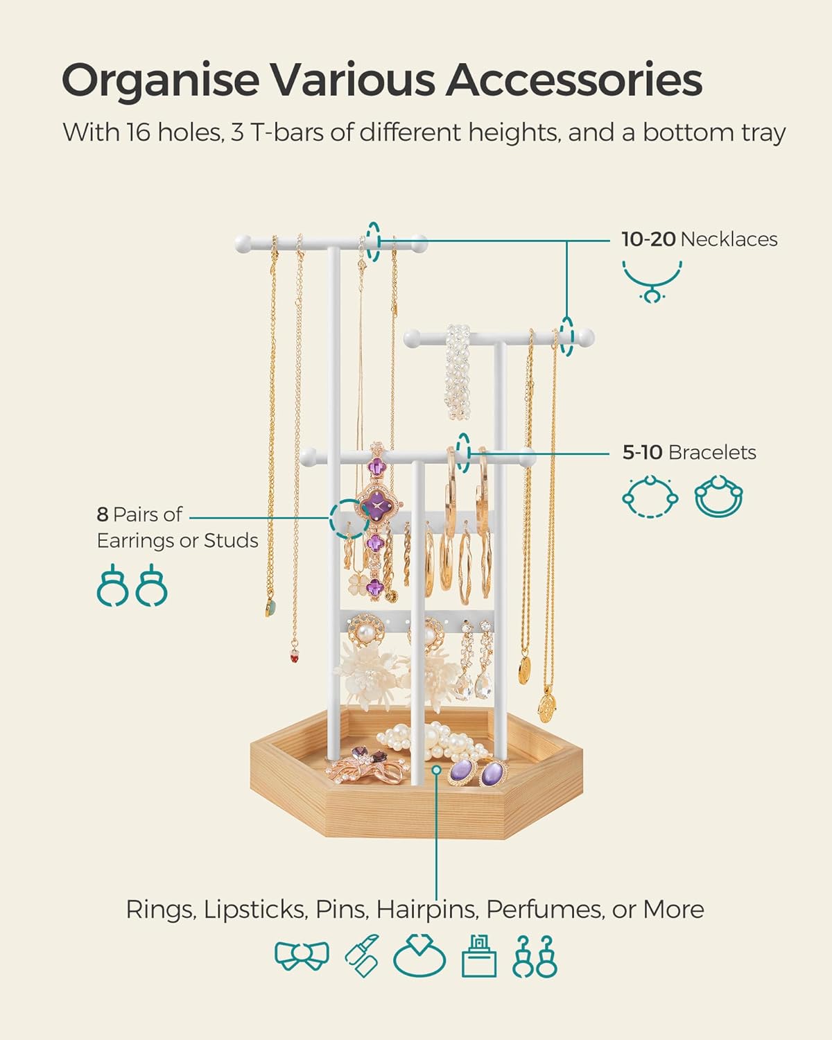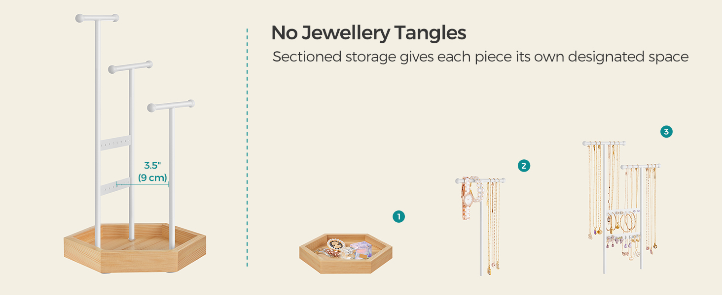 3 különböző magasságú T alakú rúddal rendelkezik a hosszú és rövid nyakláncok vagy karkötők tárolására, egy fülbevaló panellel és egy alsó tálcával a gyűrűk és egyéb kiegészítők számára.