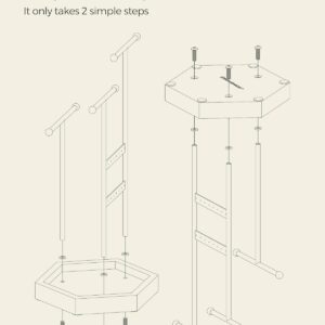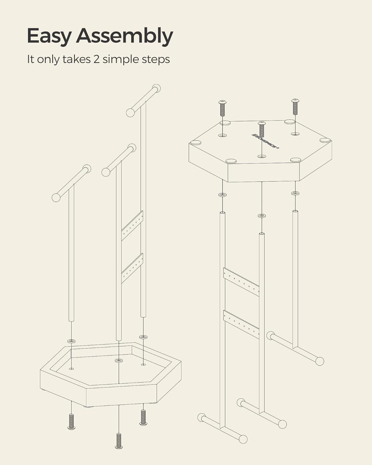 Az ékszertartó stabil és biztonságos menedéket biztosít ékszereinek. értékes, köszönhetően a hatszögletű alapnak és a 3 db T-alakú fémrúdnak, amelyek háromszögletű elosztásban vannak elhelyezve és biztonságosan az alaphoz csavarozva.