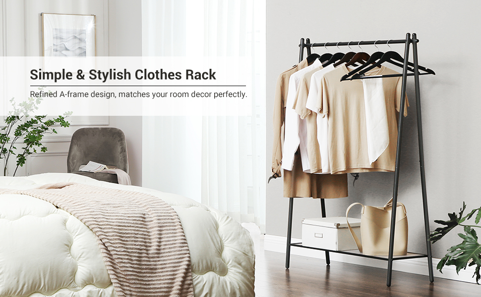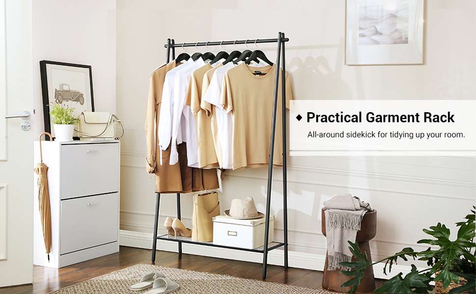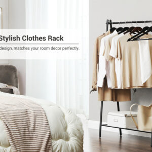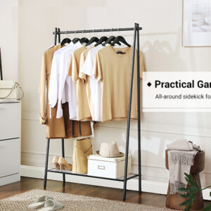 A ruhatartó erős és stabil szerkezetű vastag acélcsövekből, a sín 40 kg-ig, a polc pedig 15 kg-ig tart. Tárolja ruháit és cipőit magabiztosan, és élvezze a rendezett teret.