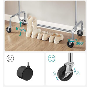 Az 1 mm vastag acélcsöveknek, amelyek vastagabbak és erősebbek, mint a szokásos 0,8 mm vastagok, valamint a strapabíró PP kerekeknek köszönhetően ez a ruhatartó 136 kg-ig bír.