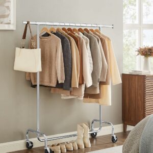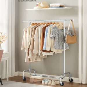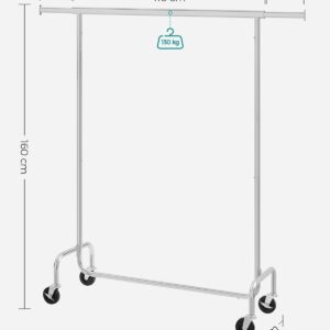 SONGMICS Ruhatartó kihúzható felső sínnel, kerekeken, állítható szélességben, 45x(110-150)x160cm, rozsdamentes ezüst