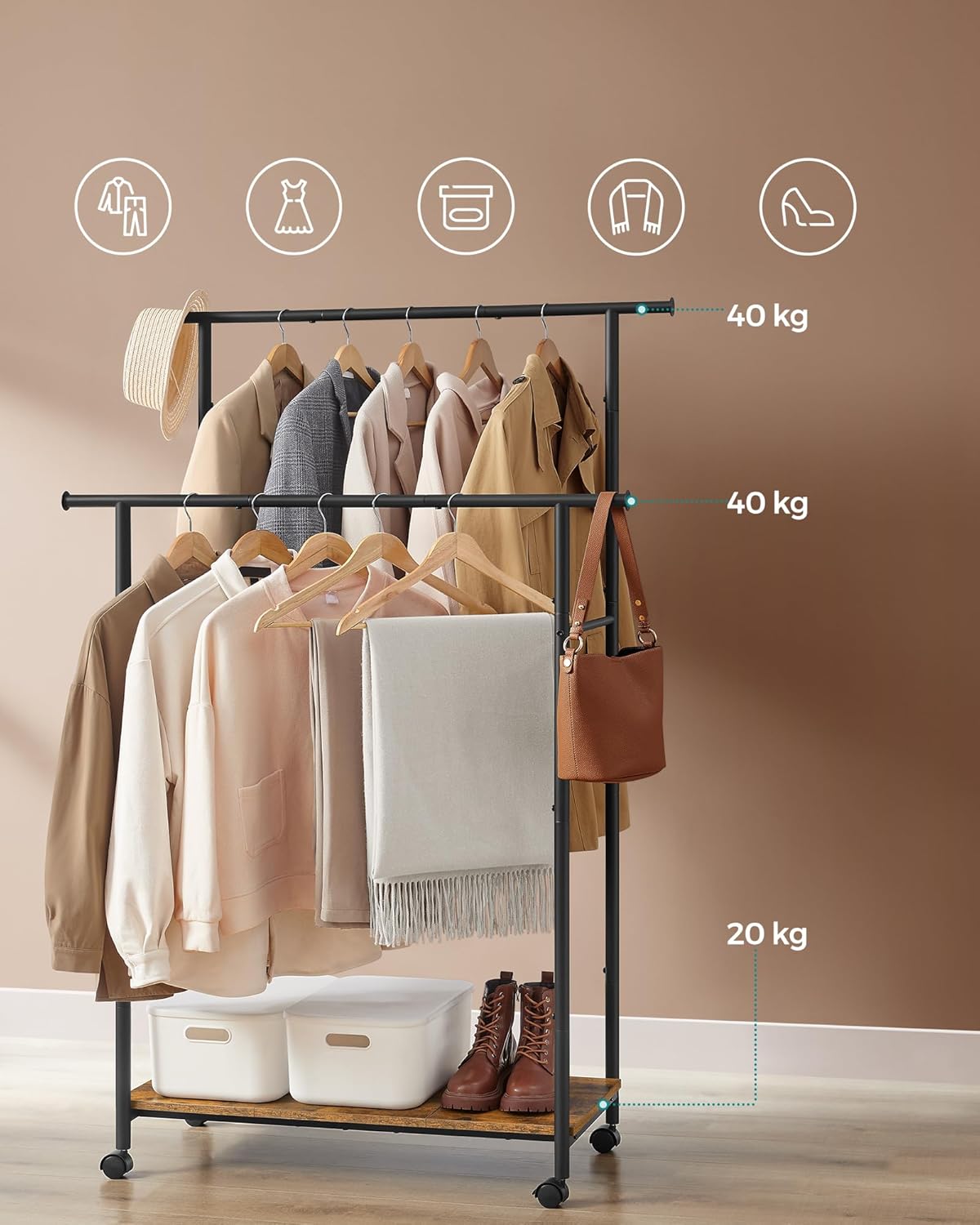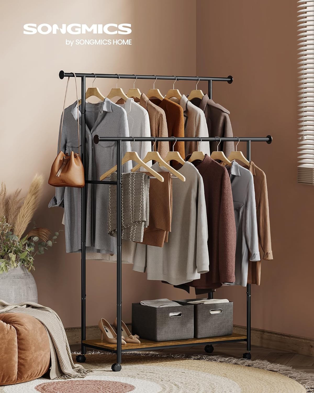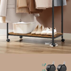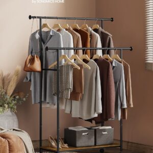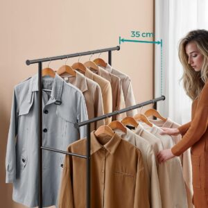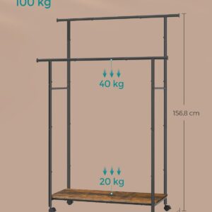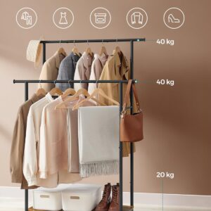 SONGMICS Suport pentru haine dublu cu 2 sine de agatat si polita inferioara, pe roti, 40x99x157 cm, negru