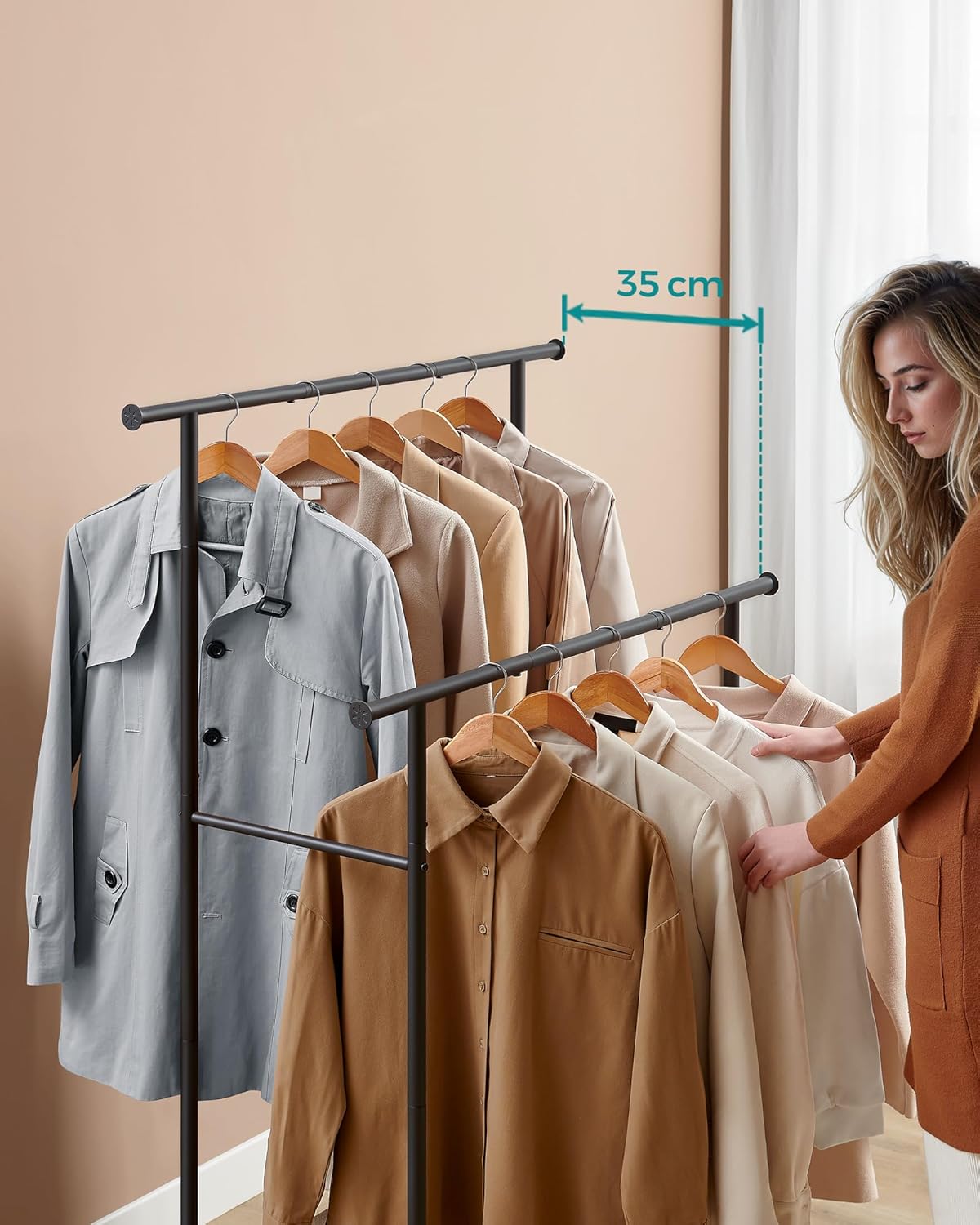 „SONGMICS Suport pentru haine dublu cu 2 sine de agatat si polita inferioara, pe roti, 40x99x157 cm, negru” értékelése elsőként