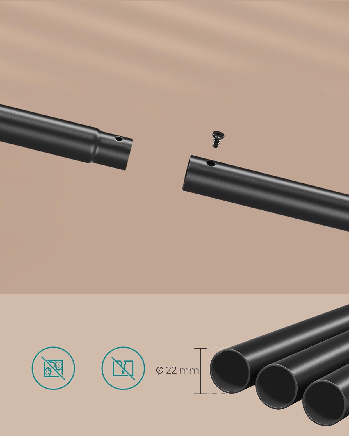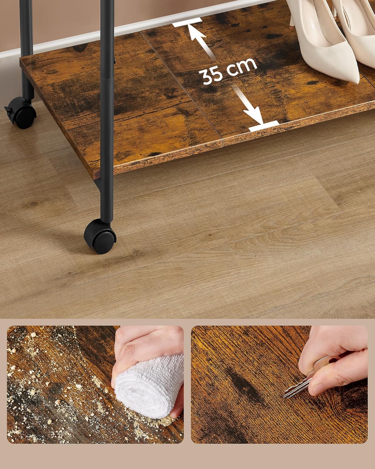 Sina solid din otel este capabila sa sustina pana la 30 kg, in timp ce raftul inferior din placi aglomerate suporta pana la 20 kg. Acest raft pentru haine va permite sa va depozitati paltoanele si cizmele grele de iarna fara nicio problema.