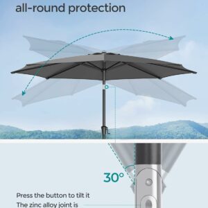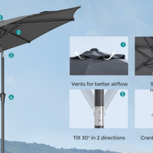 Ennek a napernyőnek a teteje 30°-ban 2 ellentétes irányba dönthető – csak meg kell nyomni a csuklón lévő gombot a billentéshez. A cinkötvözetből készült kötés erősebb és biztonságosabb, mint a szokásos alumíniumötvözetből készült kötés.