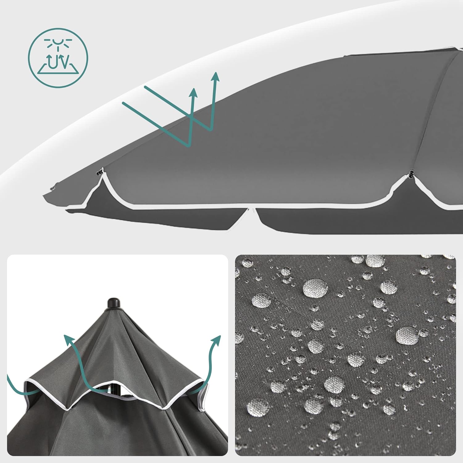 - Material: Stalp metalic, baldachin din poliester acoperit cu PA de 160 g/m², nervuri din fibra de sticla