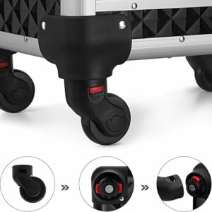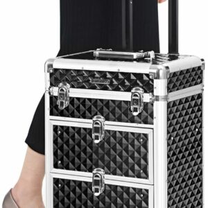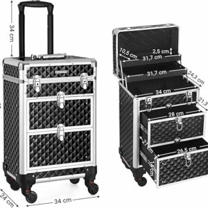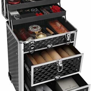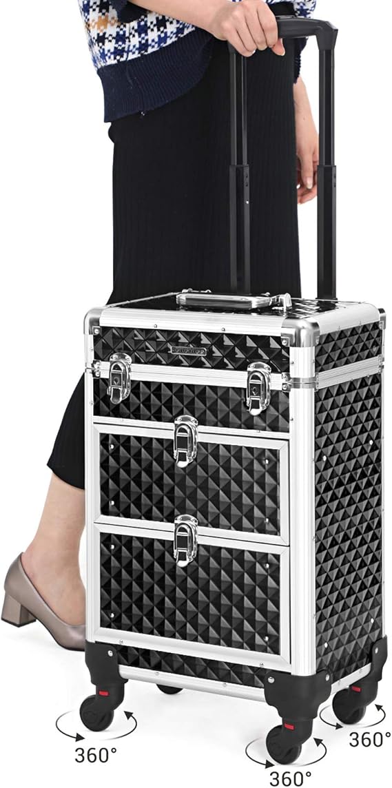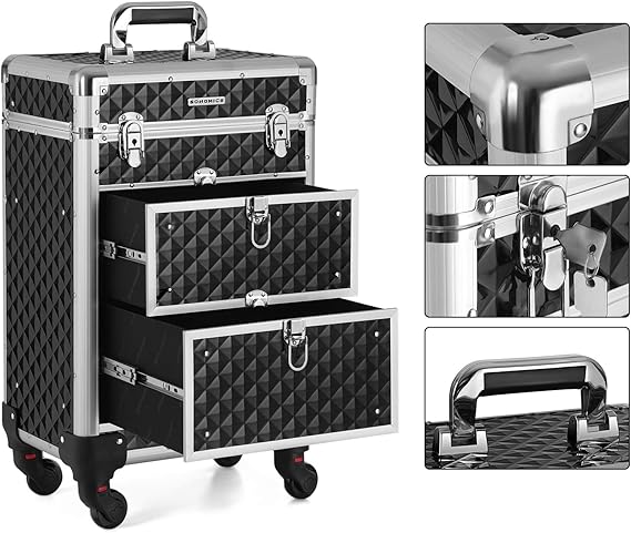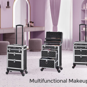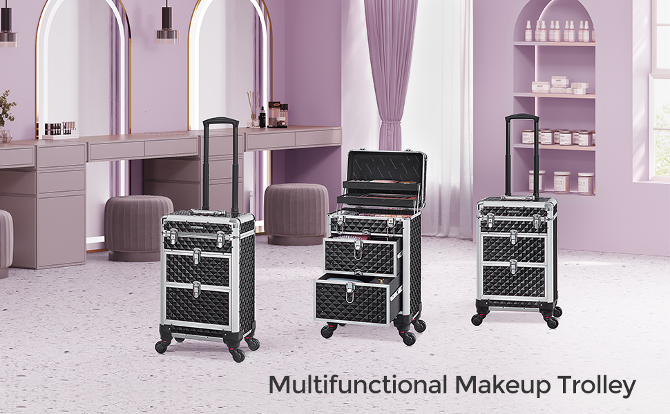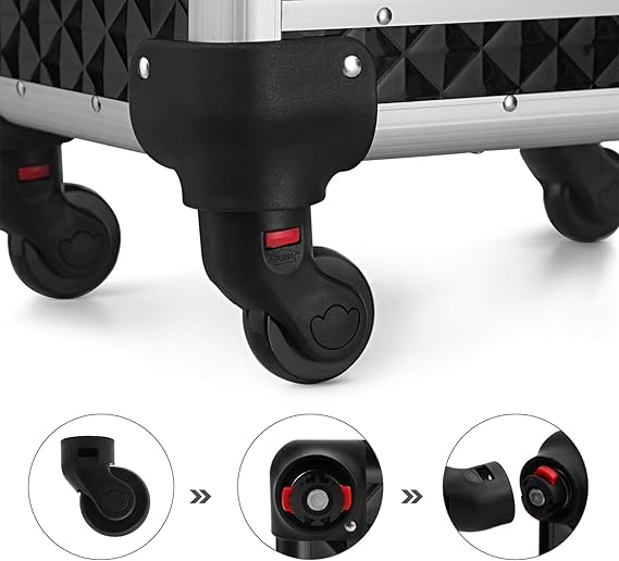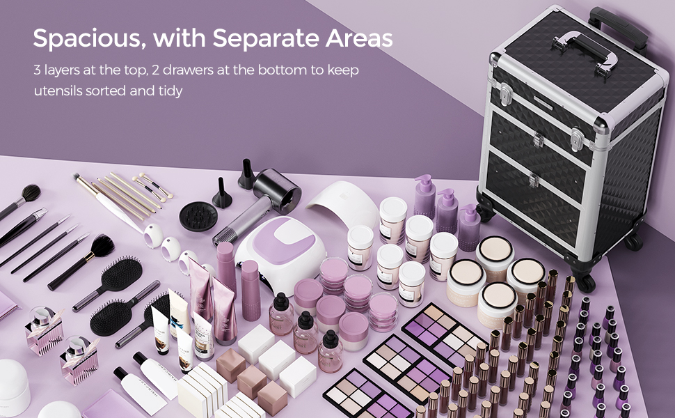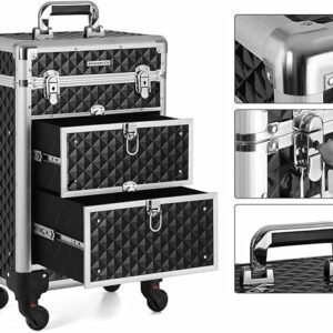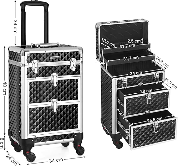 Nyissa ki ennek a sminkesdoboznak a fedelét a gombokkal és a felső rétegekkel egyszerre. Húzza ki az alsó zárakkal ellátott fiókokat, hogy könnyen hozzáférjen a benne lévő tárgyakhoz. Minőségi műanyagból készült, felülete vízálló és könnyen tisztítható. Az alumínium keret és a sarokvédők masszívvá és ütésállóvá teszik (terhelhetősége 10 kg). A tépőzáras rögzítőkkel megerősített teleszkópos markolat tartós. A 3 felső réteg elválasztókkal kategóriákba rendezi az apró tárgyakat, például a rúzsokat és a szemhéjfestékeket. 2 nagy alsó fiók a szárítógéphez való. haj- és UV körömlámpa. A 4 kerék kivehető, könnyen felszerelhető és 360°-ban elforgatható, így bárhová könnyedén görgetheti ezt a szépségkocsit. A mellékelt kulccsal a táskát utazás közben is bezárhatja, hogy elkerülje a tárgyak kiesését.