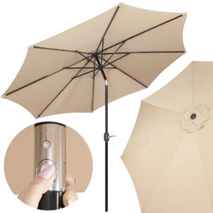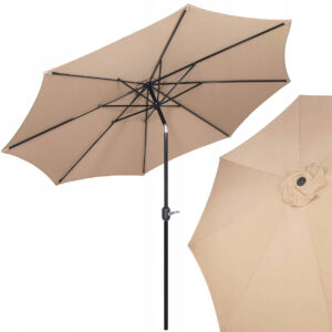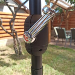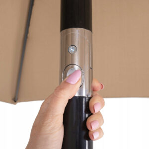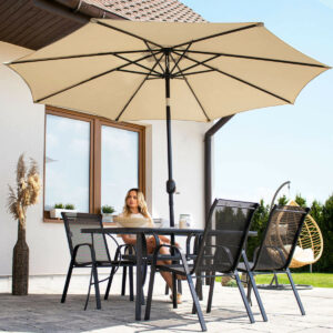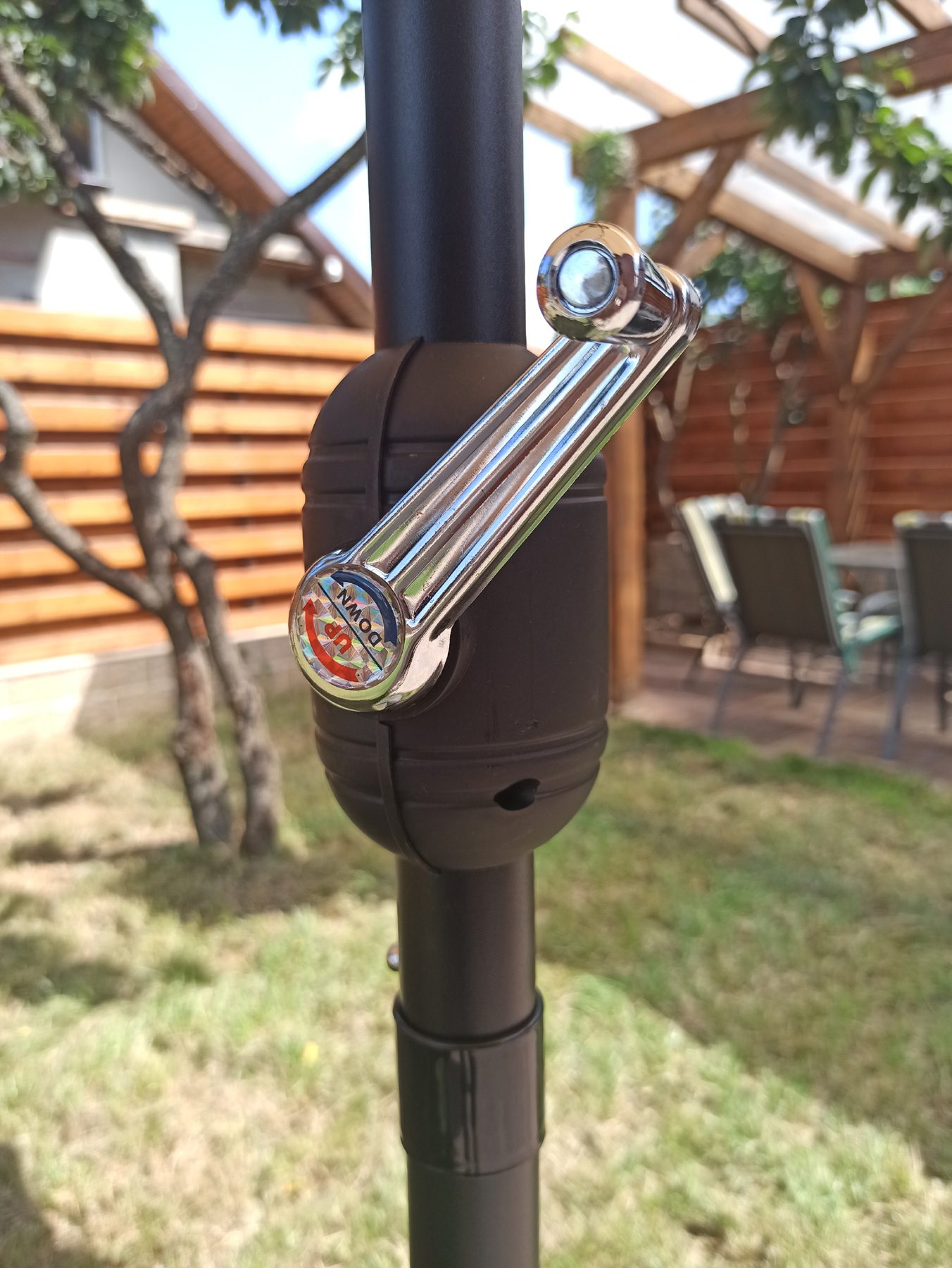 Fabricat din poliester cu protectie UV si anti-decolorare, invelisul umbrelei de soare va ofera protectie optima impotriva soarelui si este usor de curatat. Avand un diametru al stalpului de 38 mm, aceasta poate fi montata si in mijlocul meselor prevazute cu orificii pentru umbrele. Designul exclusiv al acestei umbrele de soare va permite sa inclinati umbrela pentru a bloca soarele, atunci cand se indreapta spre orizont. Stalpul robust din otel, impreuna cu cele 8 spite durabile, asigura stabilitate si durabilitate umbrelei. Aceasta umbrela de gradina poate fi deschisa si inchisa cu usurinta datorita mecanismului cu manivela. Produsul este usor de asamblat.