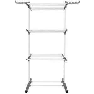 A három ruhanemű felakasztására szolgáló platform és a lenyűgöző számú cső – mindegyik platformon 8 – páratlan sokoldalúságot kínál. A kerekeknek köszönhetően szükség esetén könnyedén áthelyezheti a szárítógépet egy alkalmasabb helyre – még akkor is, ha teljesen meg van töltve ruhával.