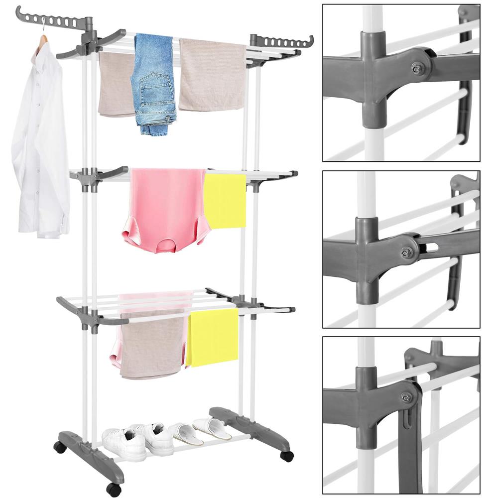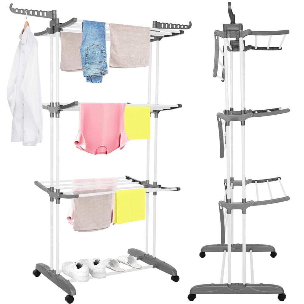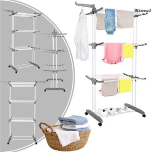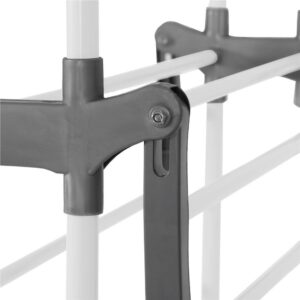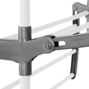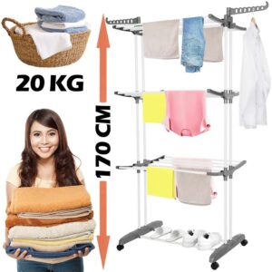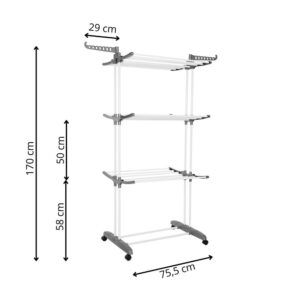Szilárd anyagokból készült szárítógépünk tartós és stabil. Teljesen feltöltött állapotban sem kell aggódnia a stabilitása miatt. Az összecsukható mechanizmus lehetővé teszi a szárítógép gyors és egyszerű tárolását használat után, ami rendkívül praktikus, különösen korlátozott hely esetén. A kerekek megkönnyítik a mozgást egyik helyről a másikra.