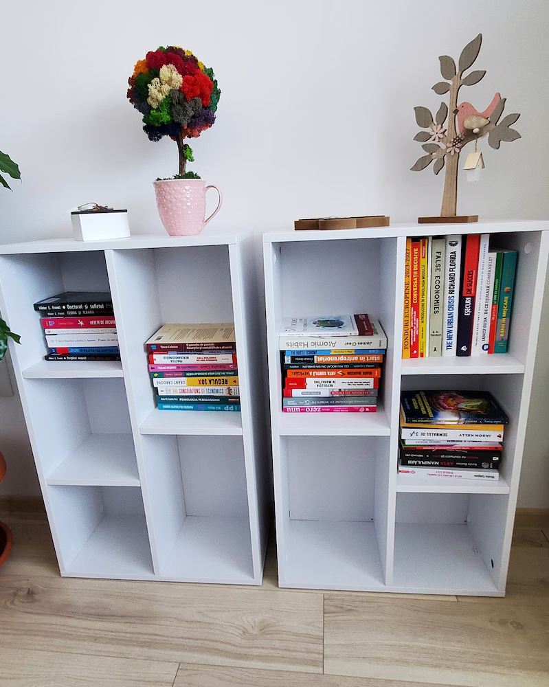 O multime de spatiu de depozitare: Raftul are 5 compartimente pentru carti, DVD-uri, CD-uri, plante in ghiveci si decoratiuni (fiecare locas are o capacitate de pana la 10 kg); 2 nagy rekesz tökéletes az irodai akták rendezéséhez.