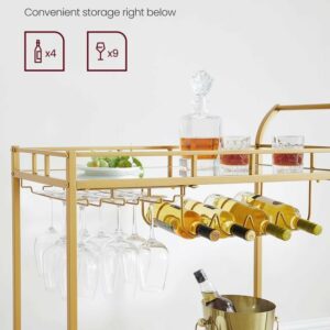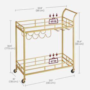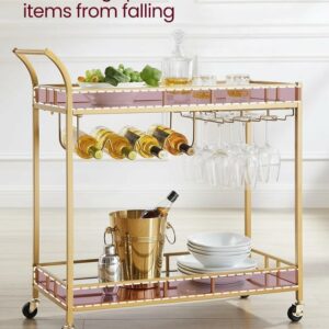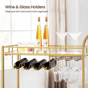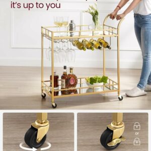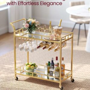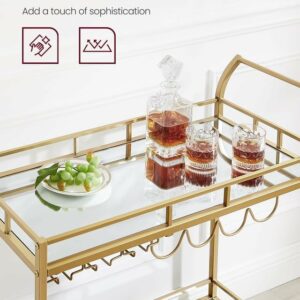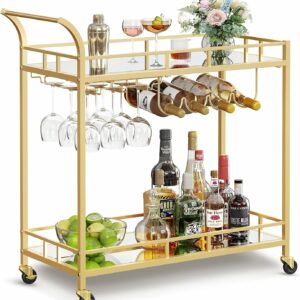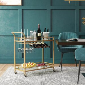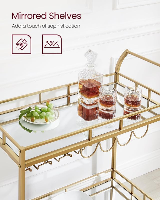 Dispunand de un cadru auriu elegant, rafturi cu oglinda si un maner curbat elegant, acest carucior de servire este o sansa buna de a-ti expune stilul in timp ce iti imbogatesti zona de bar, sala de mese sau bucataria.
