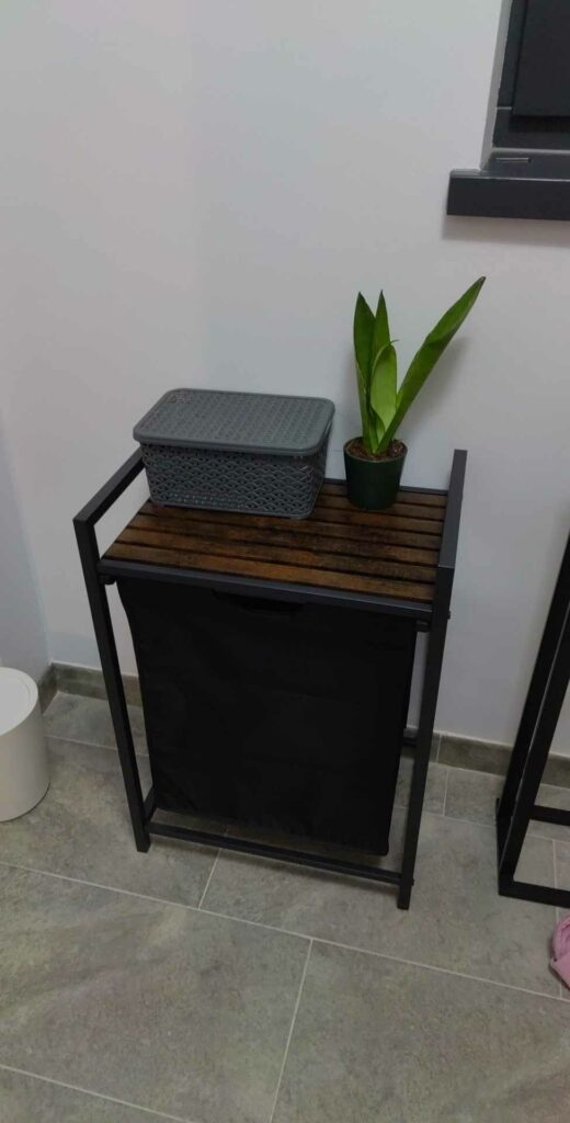 Raft de depozitare cu sipci: Acest cos de rufe are un raft, oferind spatiu suplimentar pentru a organiza detergentii sau articolele de toaleta. A rácsos kialakítás lehetővé teszi a levegő keringését a jó szellőzés érdekében, megakadályozva a ruhaszagok felhalmozódását