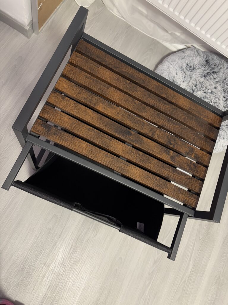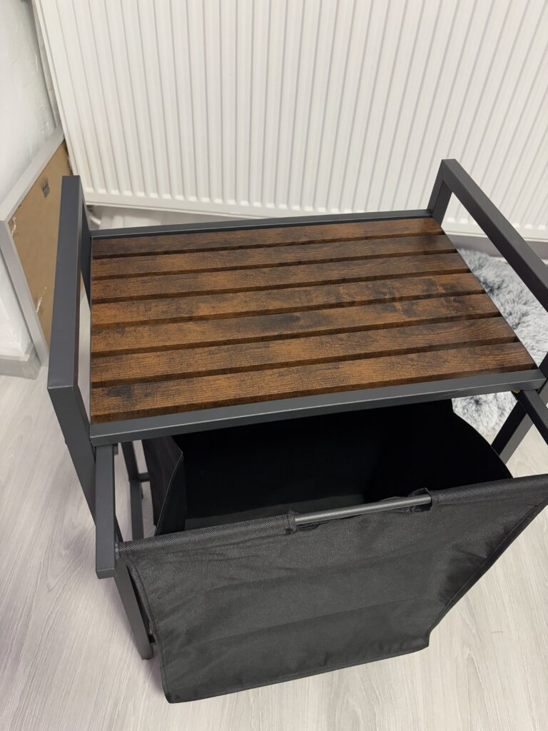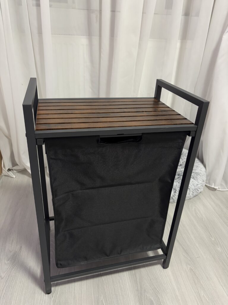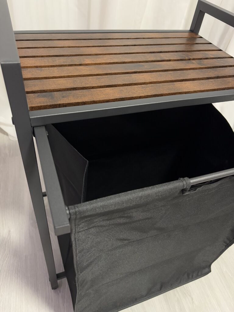 A 2 cm-es acélcső kerettel és MDF panellel készült szennyeskosár akár 20 kg-ot is elbír a felső polcon. Ezenkívül a bélés vízlepergető Oxford anyagból készült, a négy állítható láb biztosítja a stabilitást