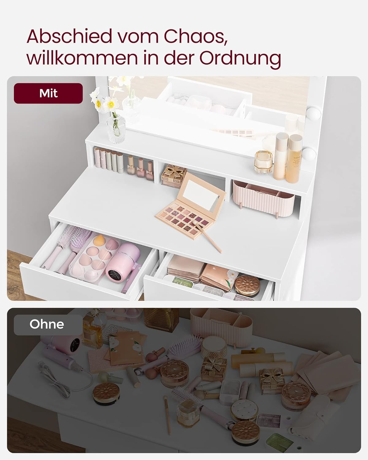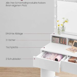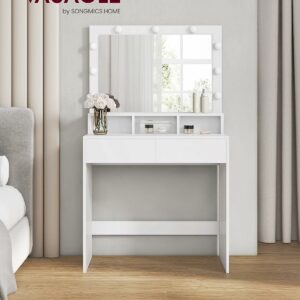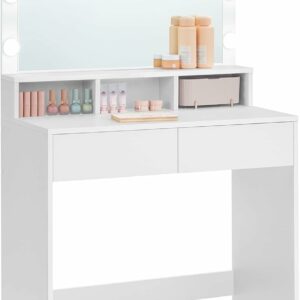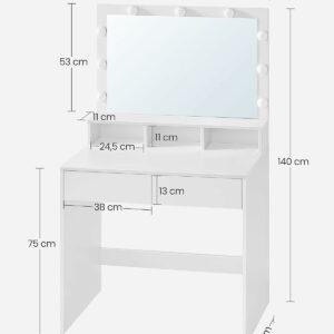 VASAGLE Masa de toaleta cu oglinda, iluminare LED, 2 sertare si 3 compartimente deschise, 80x40x140cm, modern, alb