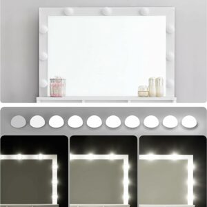 Perfect stilizat: Cele 9 becuri reglabile ale acestei masute de toaleta care inconjoara oglinda pot fi atenuate prin apasarea intrerupatorului si iti lumineaza zona de infrumusetare – astfel incat sa poti evoca un machiaj perfect.