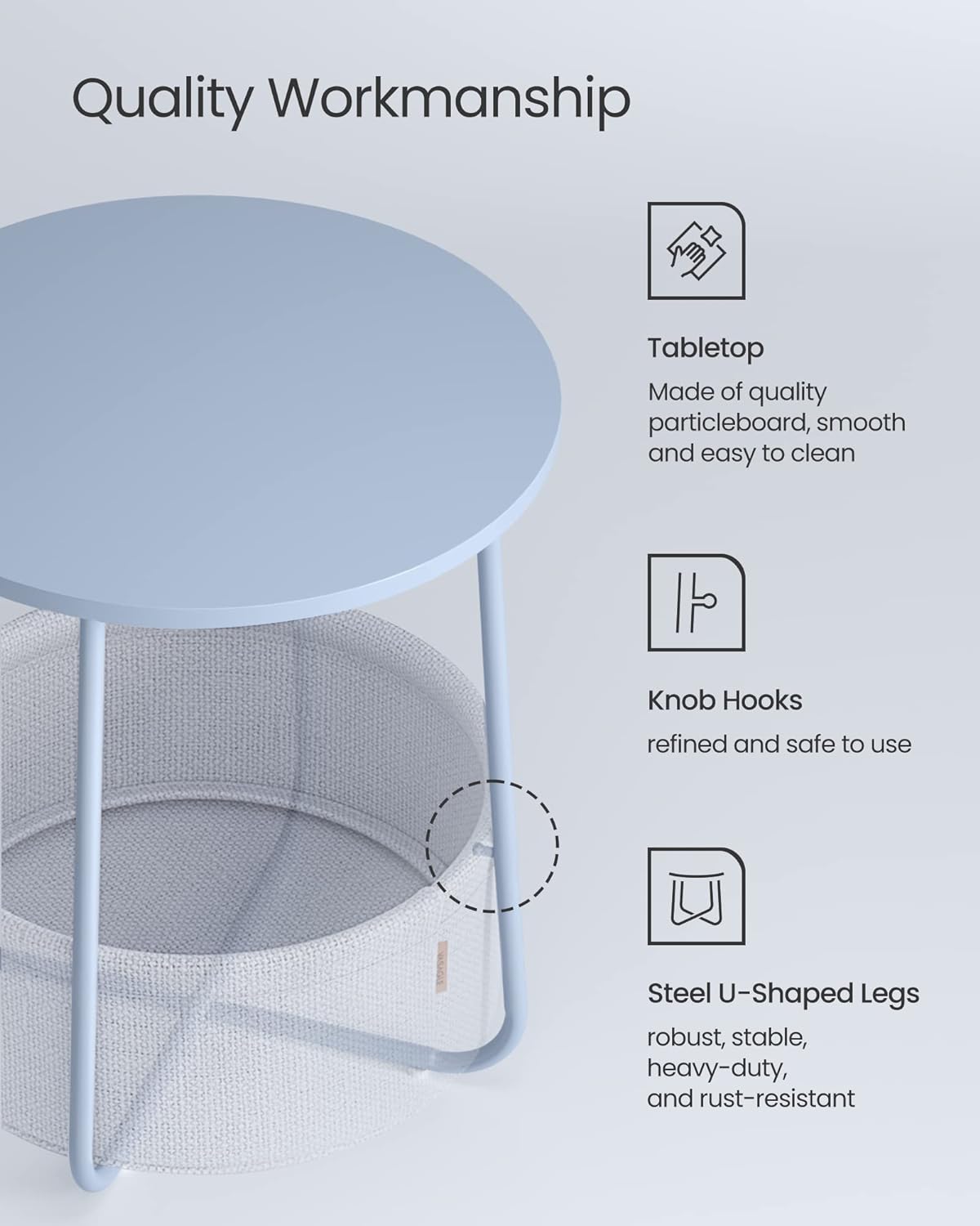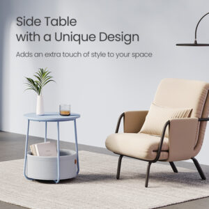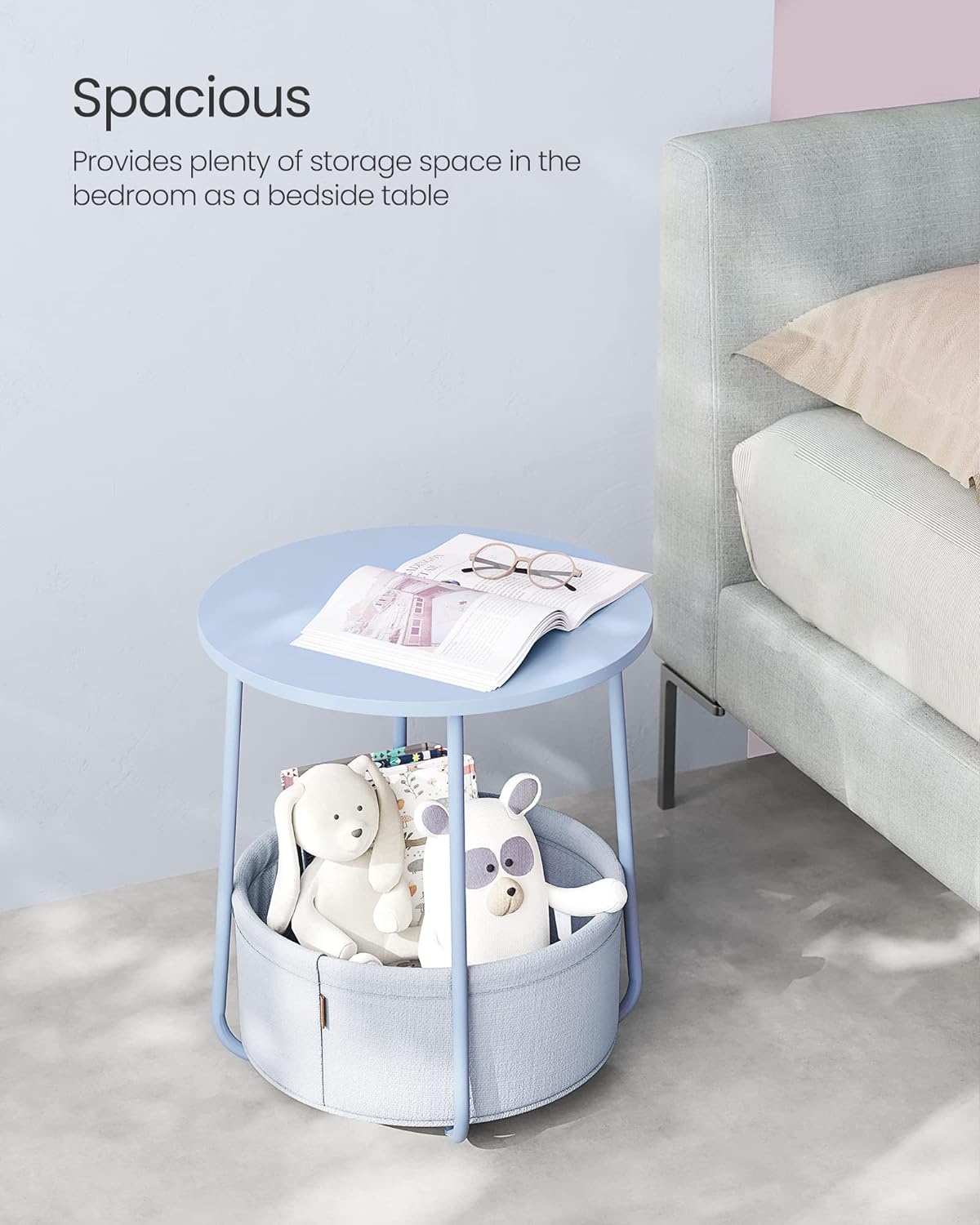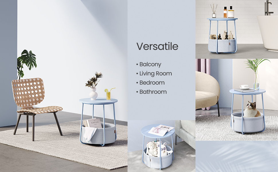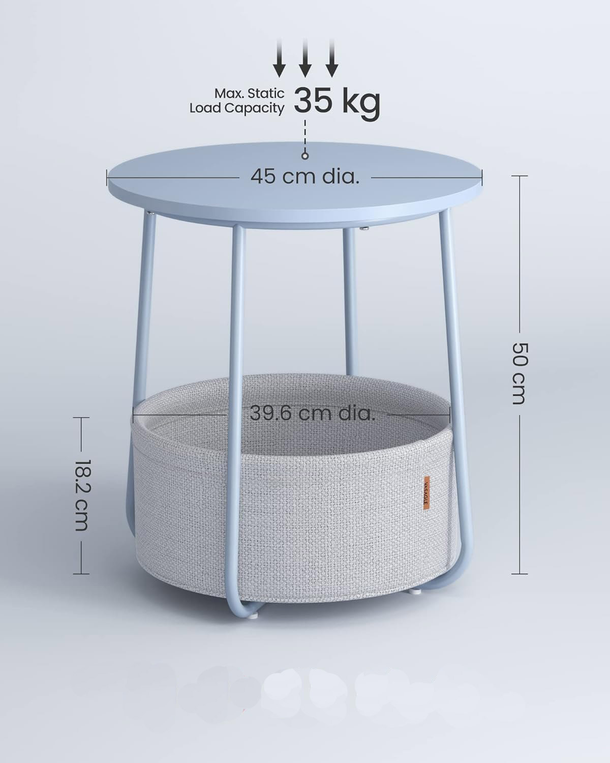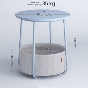 Potrivita pentru spatii mici: Masuta de 45 x 50 cm (diametru x inaltime) are un cos de 39,6 x 18,2 cm (diametru x inaltime) si este potrivita pentru spatii mici. A nappaliban kisasztalként vagy a hálószobában éjjeliszekrényként kevés helyet foglal el, és sok tárolóhelyet kínál.
