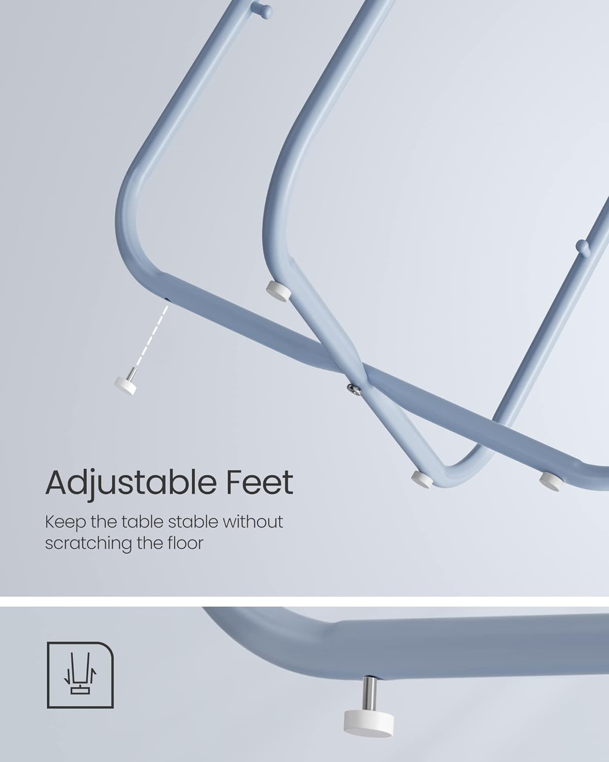 Solida si stabila: Placile aglomerate solide sunt atasate la cadru ferm. Az egyrészes acél U-lábak erős rögzítést biztosítanak. Az állítható lábak növelik a stabilitást és védik a padlót a karcolásoktól.