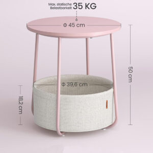Potrivita pentru spatii mici: Masuta de 45 x 50 cm (diametru x inaltime) are un cos de 39,6 x 18,2 cm (diametru x inaltime) si este potrivita pentru spatii mici. A nappaliban kisasztalként vagy a hálószobában éjjeliszekrényként kevés helyet foglal el, és sok tárolóhelyet kínál.