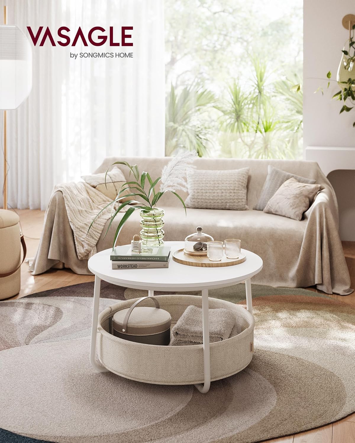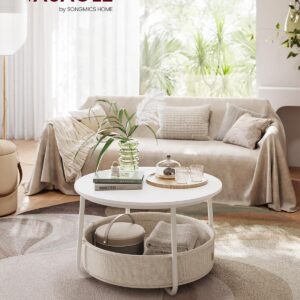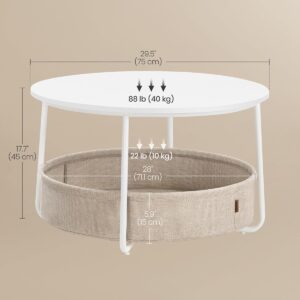 VASAGLE Kerek dohányzóasztal szövetkosárral, modern stílusú, 45x75cm, fehér bézs színű