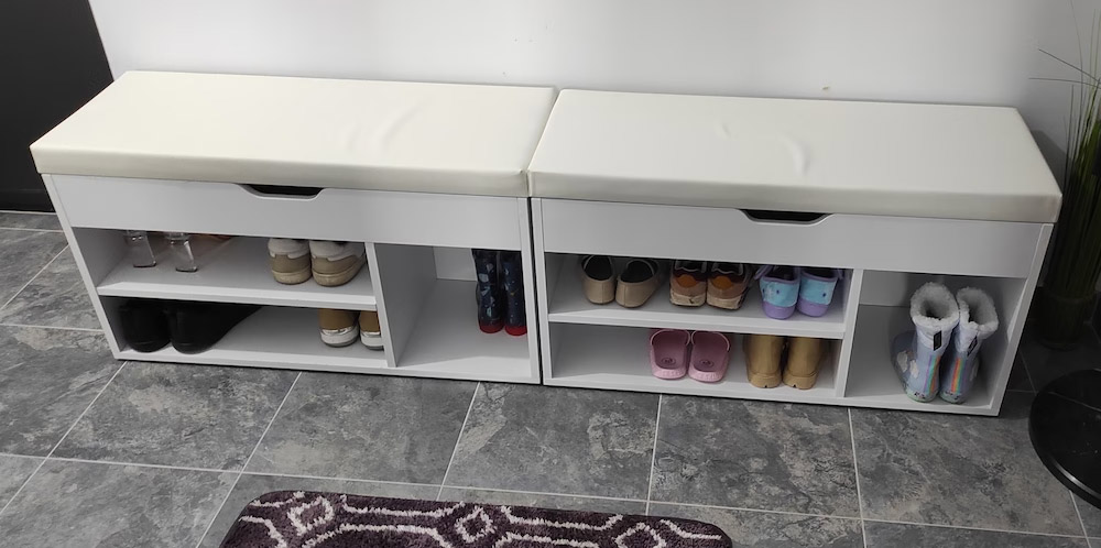 TÖBB HELY: Bal oldalon 2 rekeszben akár 6 pár cipőt, jobbra pedig bokacsizmát helyezhet el. A füles ülés alatt még egy rejtett láda is található, ahová cipőkrémet, cipőkrémet és ecsetet tehetsz