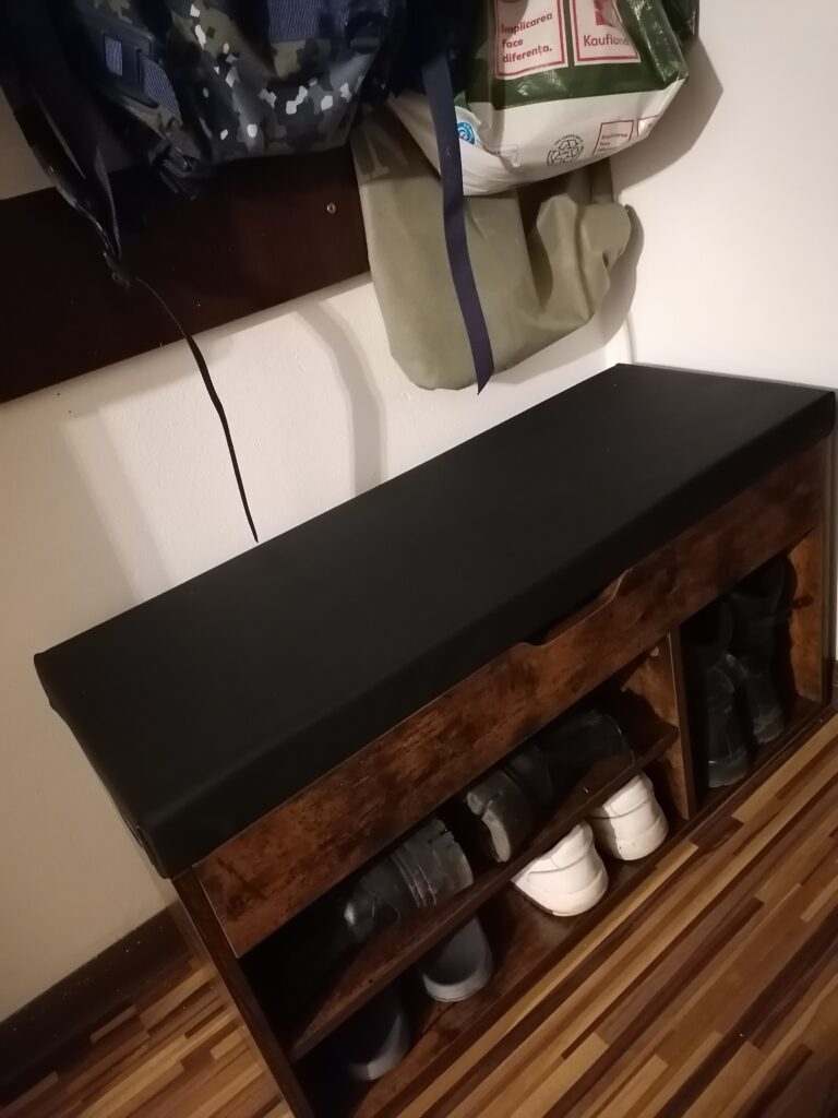 Un produs bun, in armonie cu dulapul de pantodi. Se potrivesc perfect si e foarte comod. Are sub bancheta capitonata un spatiu util pentru crema de ghete, perieii si cele necesare intretinerii incaltamintei. Asezat pe el ini pot incalta pantofii cu usurinta, bancheta fiind moale si la inaltimea potrivita.