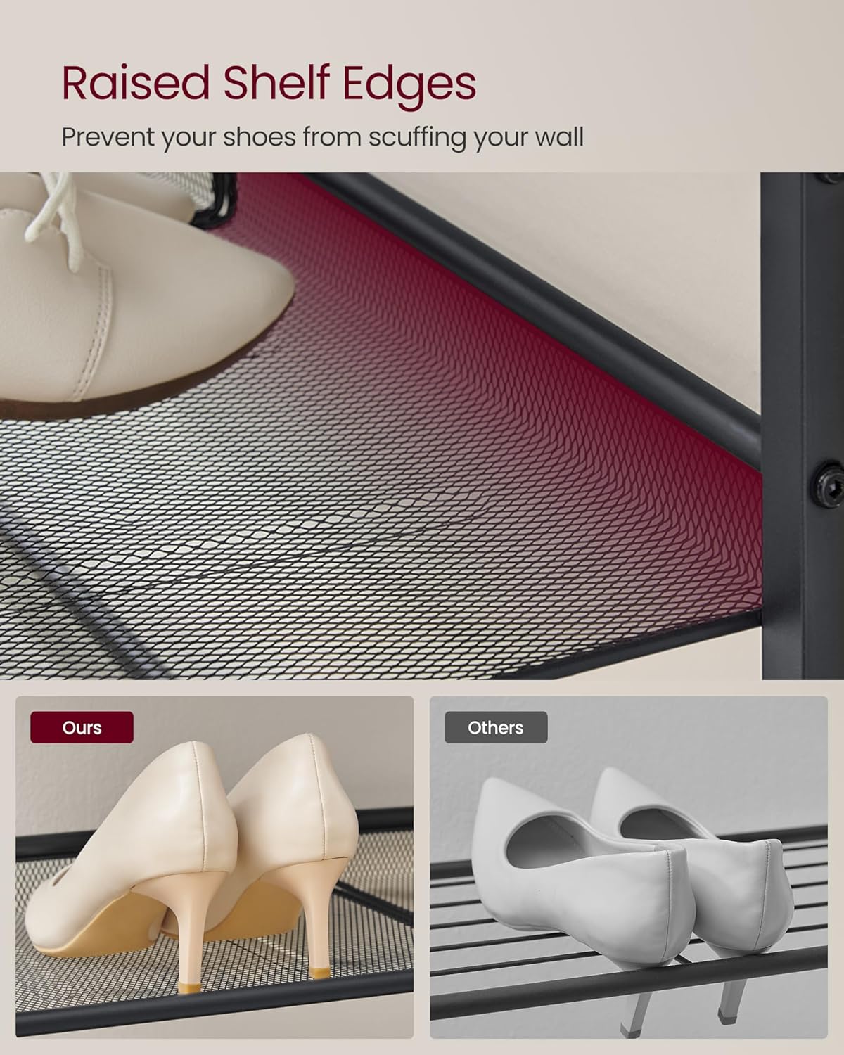 További cipőkért Ez a cipőtartó 12-16 pár cipő számára biztosít elegendő helyet. Ha elegendő hely van a drótpolcok között, még magassarkút vagy bokacsizmát is tárolhat ezen a cipőtartón