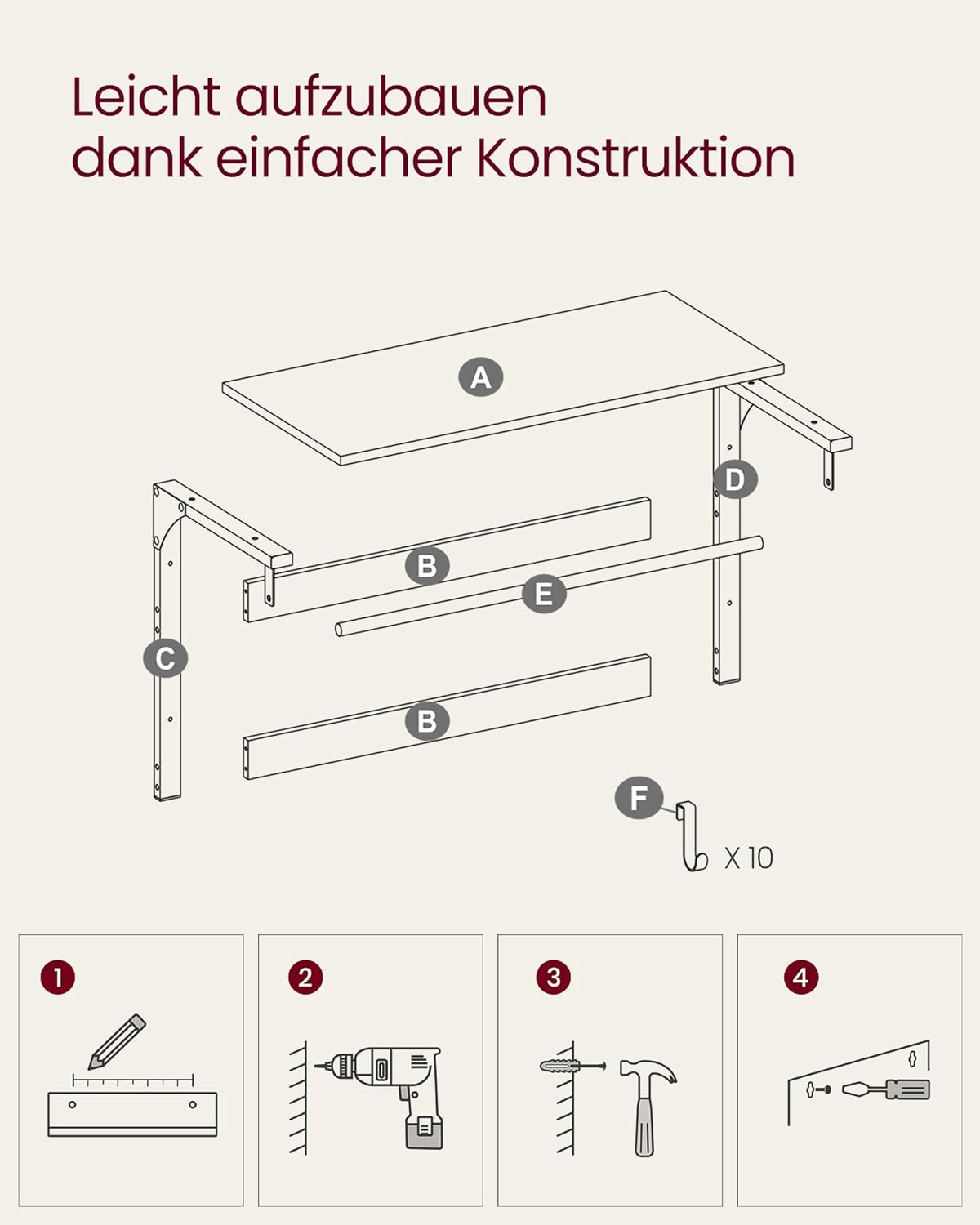 Könnyen telepíthető: Nem kell félni az összeszereléstől! A megjelölt részekkel és egyértelmű utasításokkal ezt a fali polcot nehézség nélkül összeállíthatja.