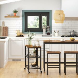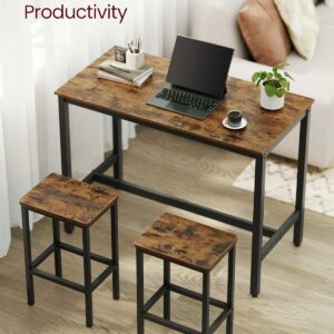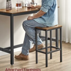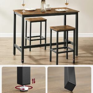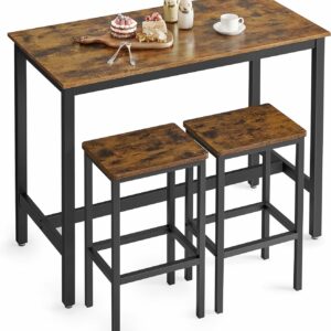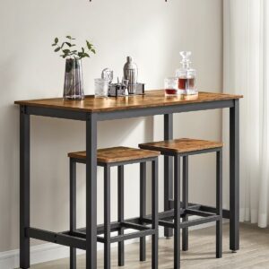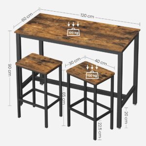 Egy bárasztal és 2 bárszék kiváló minőségű rusztikus barna bevonattal – nagyszerű kiegészítője a konyhának, a játékszobának vagy a nappalinak. A fekete acélváz nemcsak vonzó kontrasztot alkot a fa tónusával, hanem praktikus lábtámaszként is szolgál.