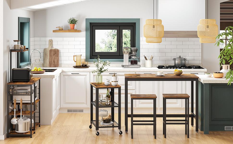 A magas asztal 120 x 60 cm-es felülettel rendelkezik, amelyre könnyen elhelyezhető zsemle, kolbász és frissen facsart narancslé. A két 40 x 30 x 65 cm-es bárszék tökéletesen illeszkedik a bárpult alá. A bárszékek és a konyhaasztal egyszerű felépítése, valamint az azonos méretű csavarok gyors és egyszerű összeszerelést tesznek lehetővé.